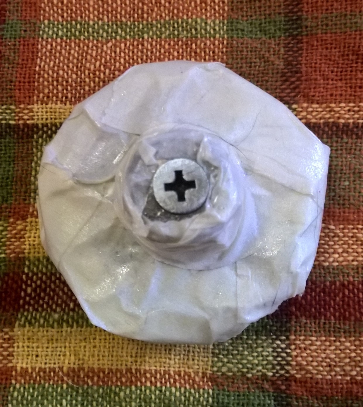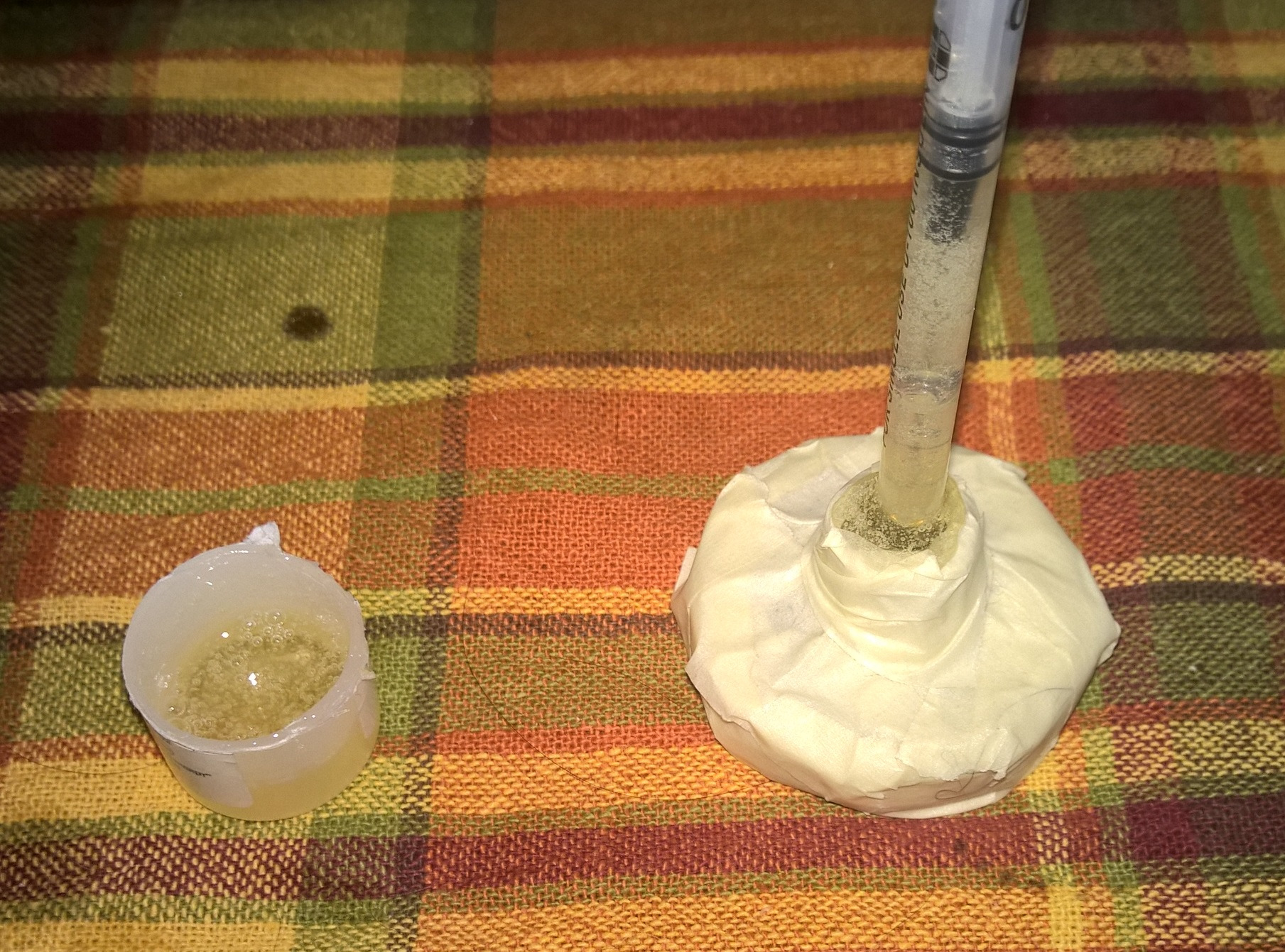 Помыл изнутри грибок, высушил. Сделал контрольный замер влажности внутри детали ватной палочкой. Развел эпоксидку и набрал ее в тонкий шприц. Задул три шприца! Сверху вложил шуруп, перевернул грибок на шуруп и оставил все мариноваться до утра.