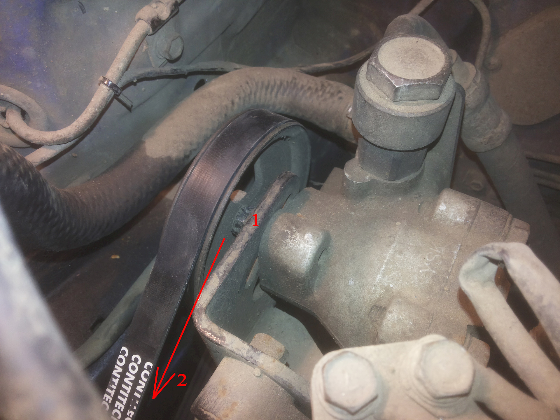Для того, чтобы ослабить натяг на ремне ГУР, необходимо все тем же рожковым ключом на 12 ослабить болт 1 и руками потянуть вал вниз.