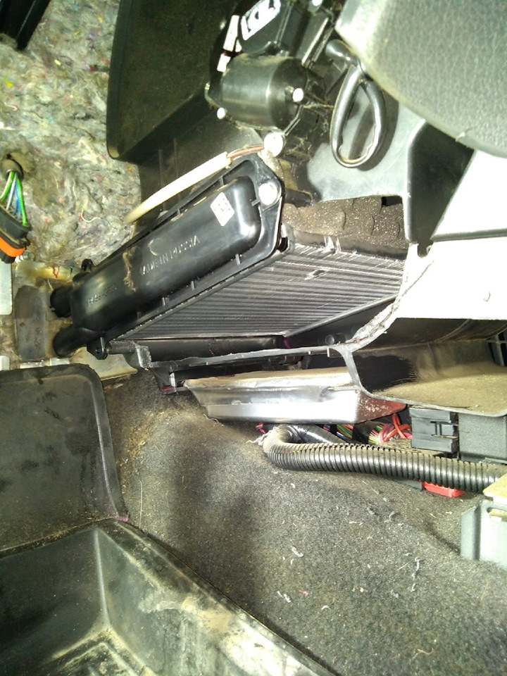 Сам лично менял отопитель. Выявилась проблема при демонтаже метал.пластины со шпилькой. Завод сделал ее практически несъёмной из салона. Сама пластина выгнулась к гайке в районе шпильки и чтобы извлеч пластину пришлось ее выгнуть в обратную сторону, рычагом из тонкой доски и подкладки. После восстанавливаем форму пластины, загибаем почти под 90* ребра жёсткости сверху/снизу.