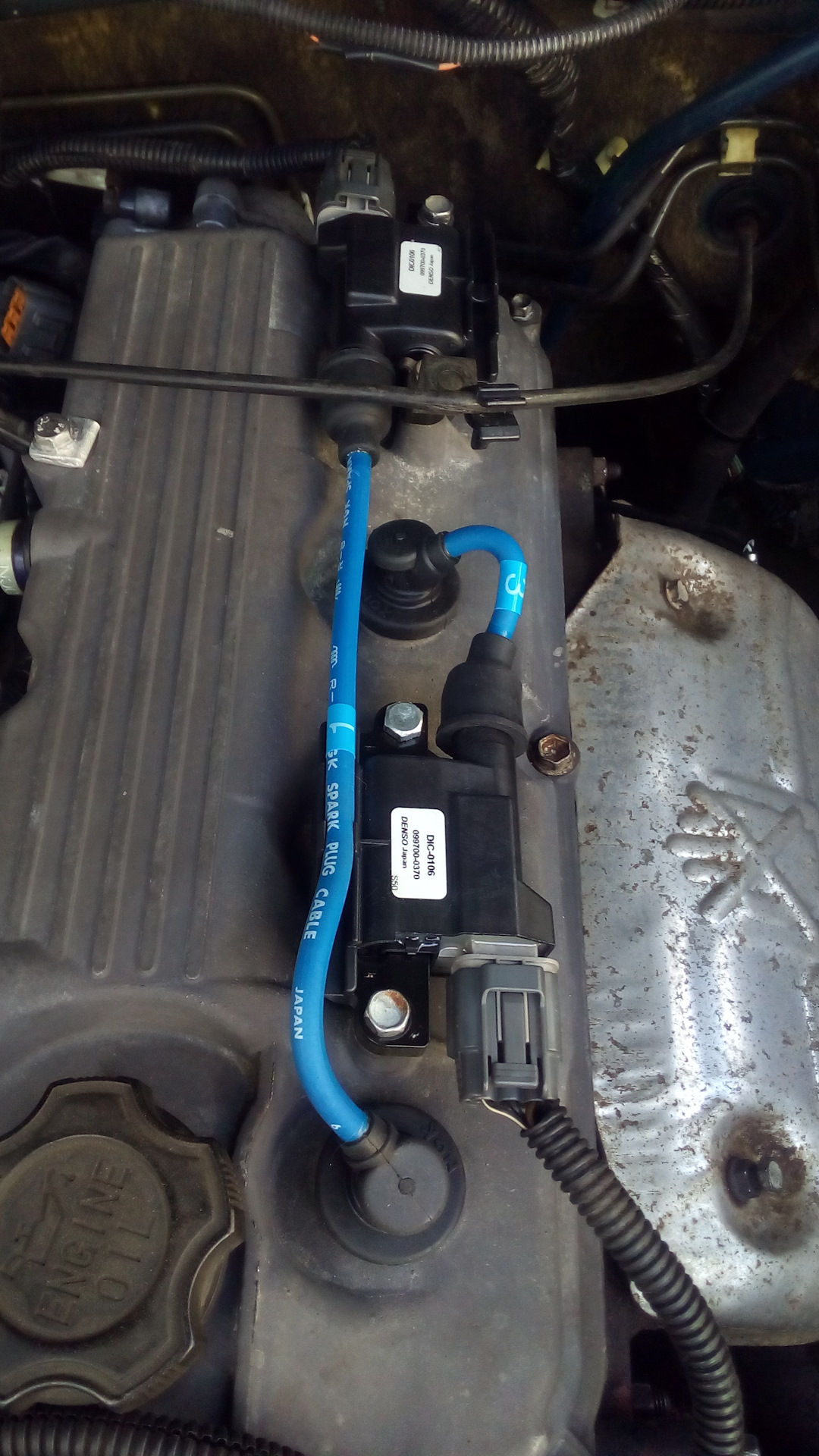 После сборки мотора и его нагрева мотор сильно затроил и еле ехал родные катушки крошились прям рукой как никак отходили 16 лет, порыв каталоги нашел что должны подойти катушки DENSO DIC-0106, также заказал новые свечи и провода, вчера всё пришло и сразу возле магазина установил и наконец то я полностью на ходу.