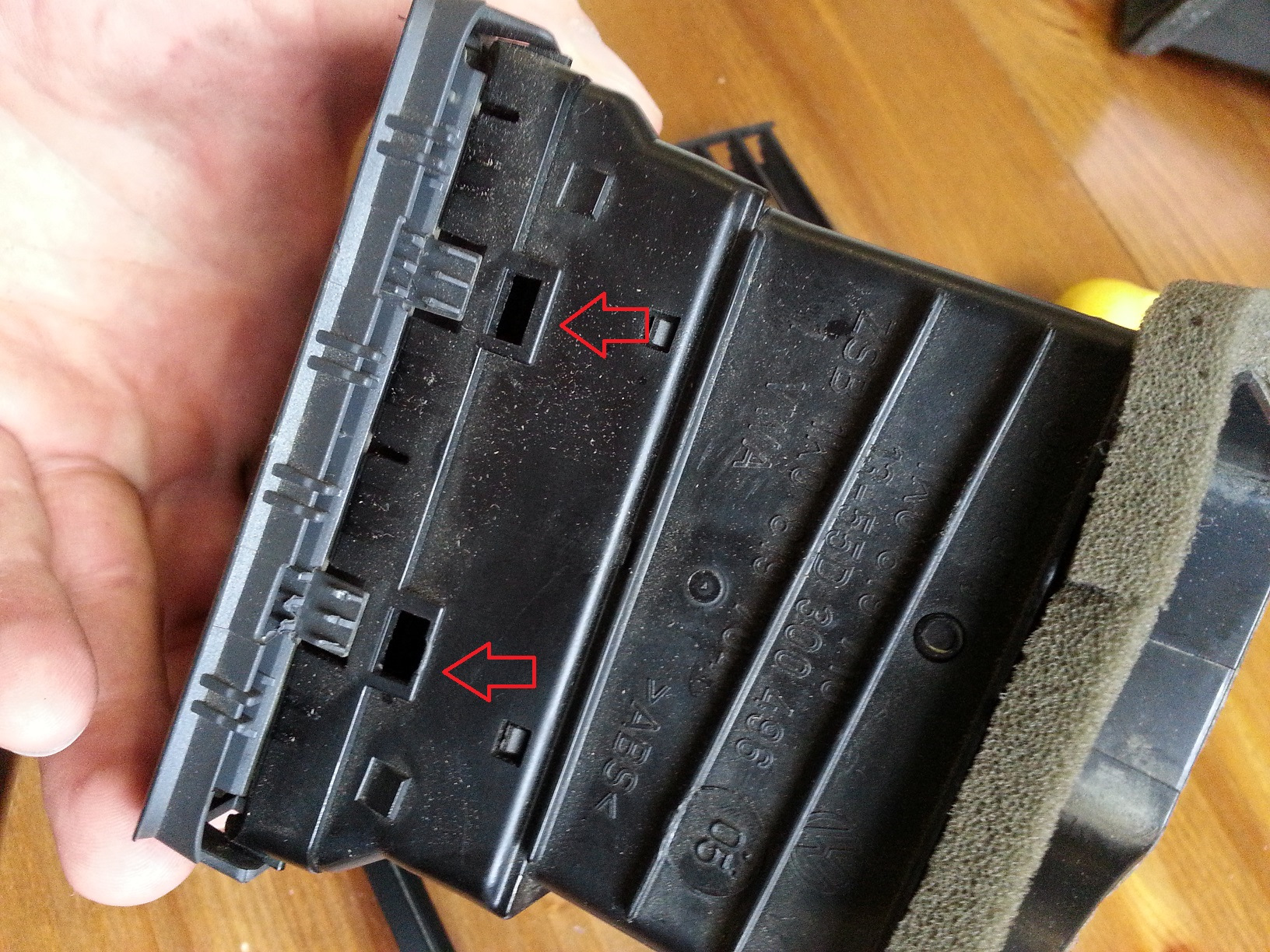 Для того, чтобы вытащить дефлектор из панели необходимо поддеть его сбоку в районе фиксаторов, я использовал простую отвертку обмотав её плотной тканью.
