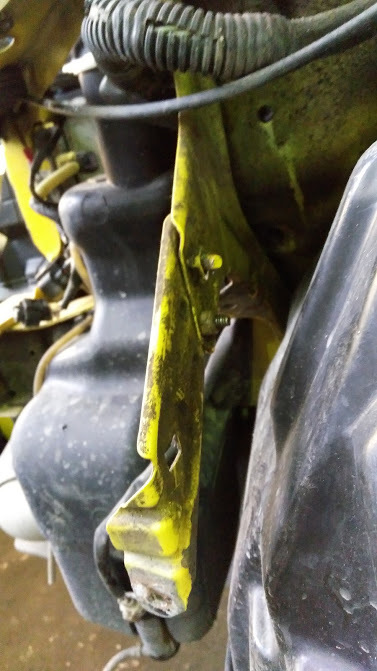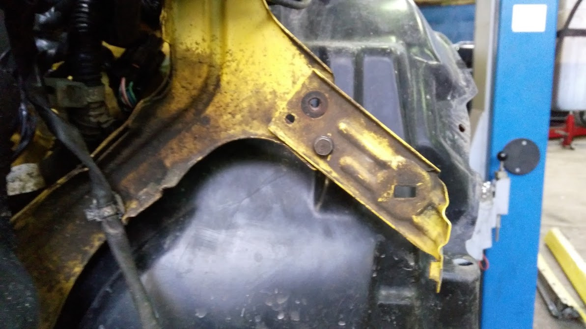 Когда была разобрана морда, выяснилось, что внутренние усилители, что держат фару и крыло, срезали болты, что держат сами усилители. Болты высверлить не удалось. Но так как там 3 отверстия, то усилители были посажены на болты в другие посадочные отверстия.