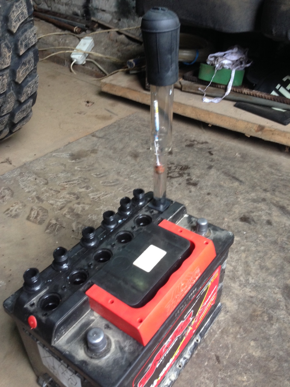 Измеряя плотность в банках было выявлено, что плотность электролита 1,21 во всех банках, а в крайней плюсовой банке 0.