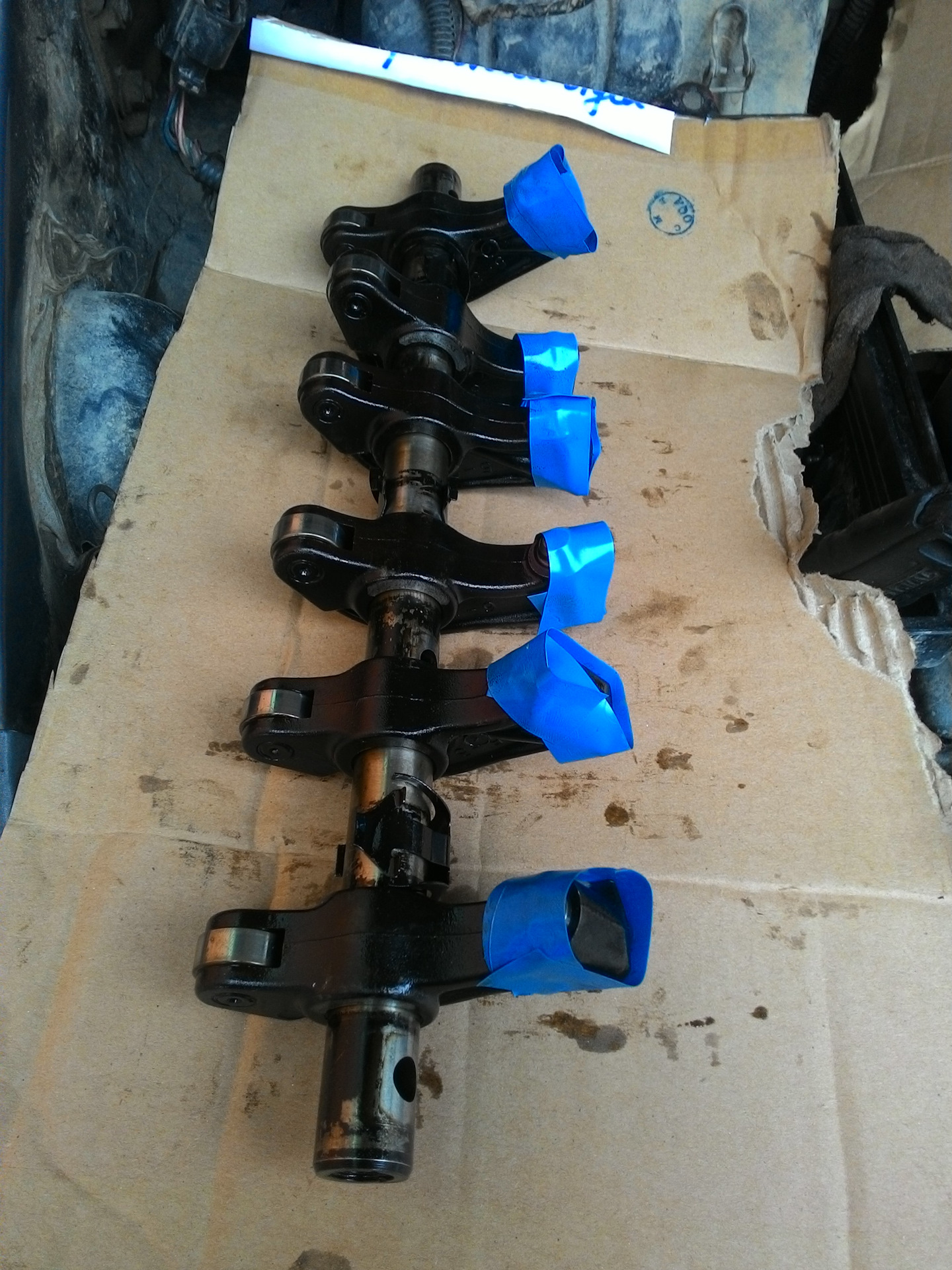Когда я ось с коромыслами собираюсь прикручивать к ГБЦ. Потому что ось и коромысла надо перевернуть, и в момент переворота часть гидриков выпадут из своих мест. Чтобы они не выпали, я их и примотал изолентой. Когда я коромысла перевернул, гидрики из них начнут упираться в пружины клапанов, и снятие изоленты не даст им никуда упасть, потому что падать некуда — впереди только эти пружины клапанов.