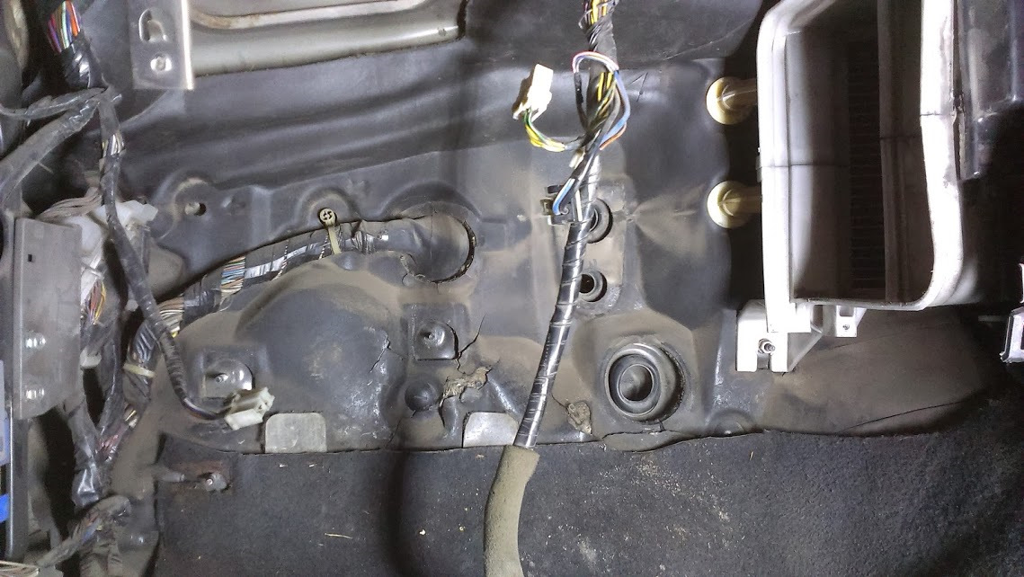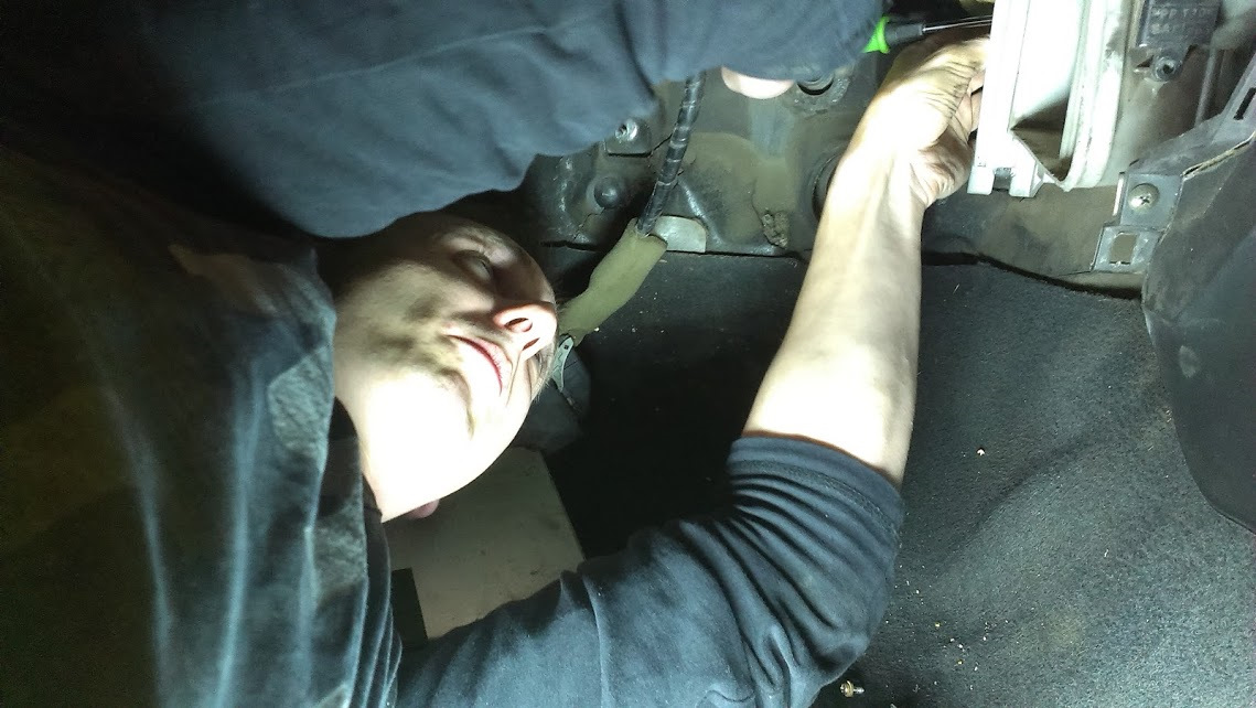 Дальше начинается самое веселое и интересное. Антифриз к этому моменту должен быть уже слит. Снимаем патрубки с печки и выкидываем/сдвигаем назад сиденье пассажира. Через заднюю дверь ложимся головой вниз и ногами держимся за спинку кресла, по крайней мере, я делал так.