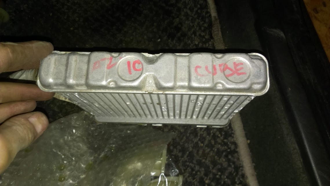 Собственно, достали радиатор. У меня почему-то стоял контрактный с Nissan Cube (судя по надписям), тонкий и бесполезный. Новый с припиской в каталоге cold region почти вдвое толще и внушает доверие.