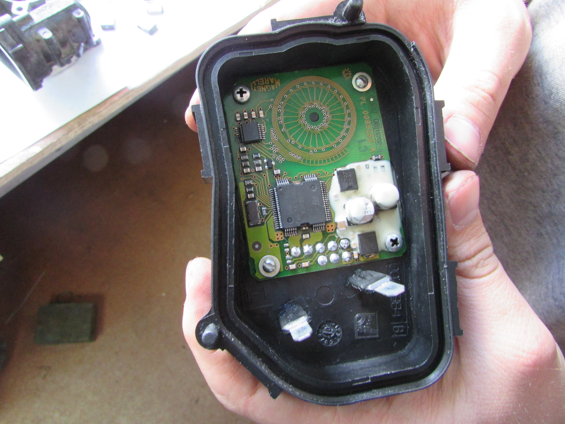 Чтобы снять плату отворачиваем крепящие её по диагонали два винта и паяльником убираем две запайки, находящиеся на противоположной от винтов диагонали. Затем нужно отпаять 8 контактов, идущих от платы на разъём. Ну и это ещё не всё)) Аккуратно крючком начинаем поддевать плату со всех сторон, немного её пошатывая, так как она ещё в нескольких местах приклеена к корпусу. Сняв плату, видим прокладку между платой и радиатором и тоже её достаём. Всё, на этом разборка закончена. После этого все разобранные детали отмываем от масла, я использовал для этого спирт и очиститель впускного тракта.