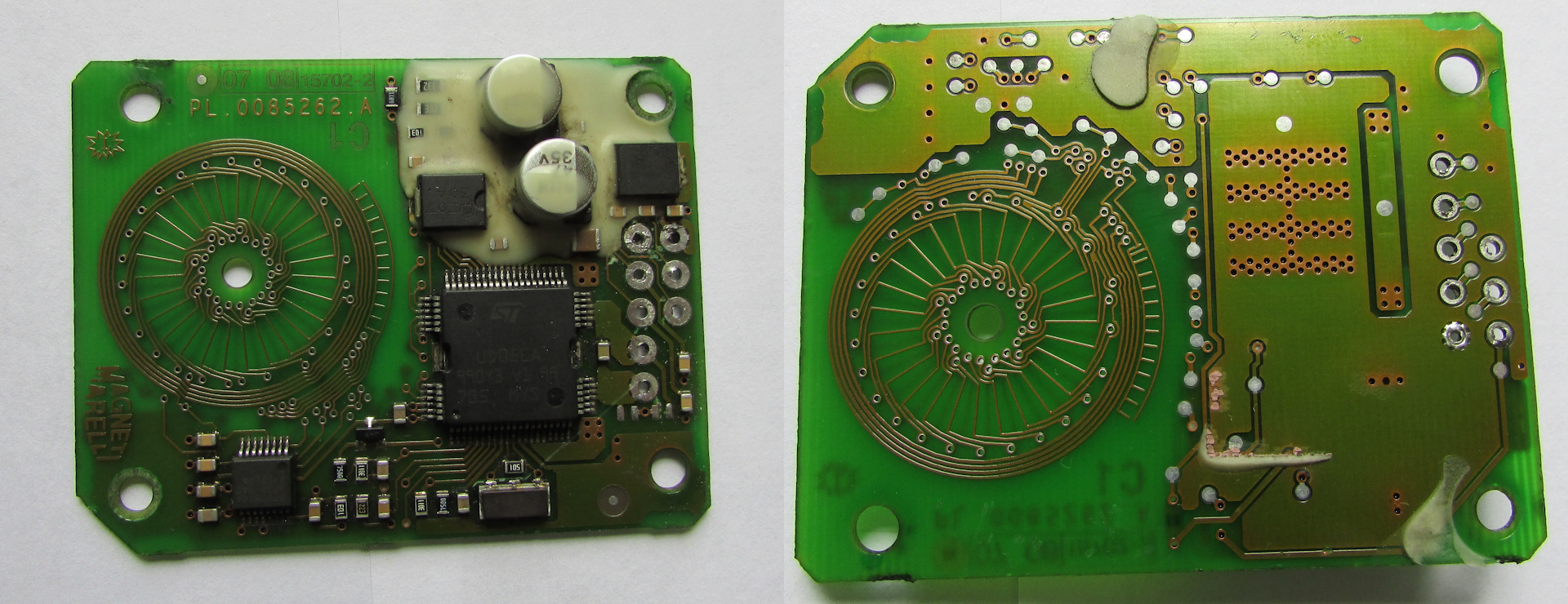 После того, как высверлили заглушку, переверните заслонку штифтом вниз и немного постучите по ней, а проще взять отвёртку, накинуть на неё магнит и извлечь штифт. Затем достаём ось заслонки с пружиной и шестернями, далее отворачиваем три винта, крепящие моторчик и достаём его наружу (запомните полярность выводов для правильной установки его обратно). Винты заслонки и крепления моторчика если не ошибаюсь под внутренний торкс 20. С этой половиной заслонки закончили. Приступаем к плате.