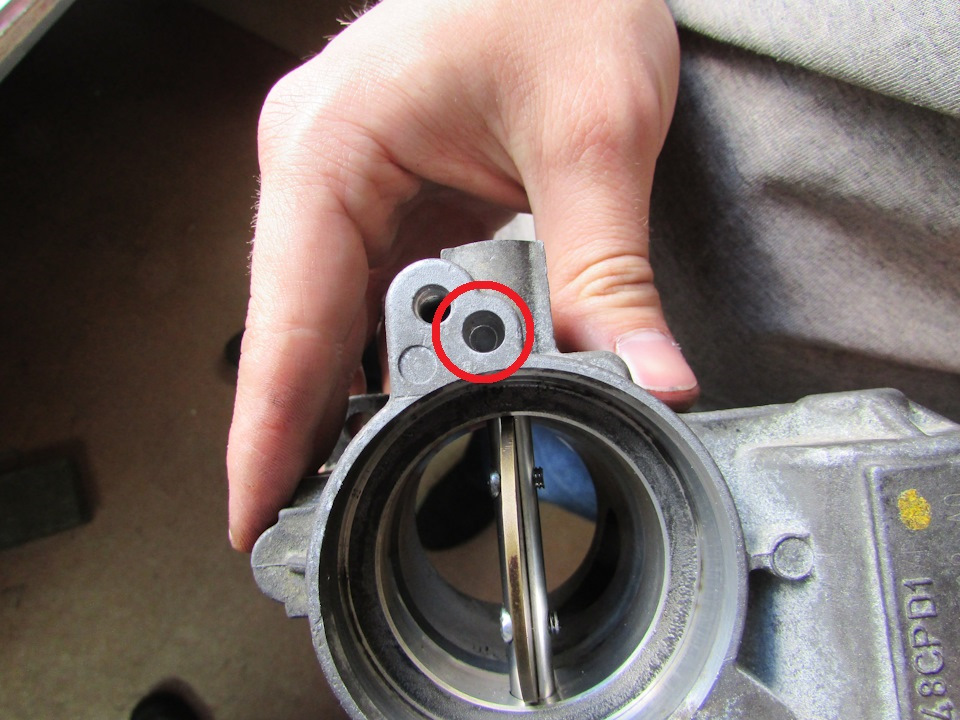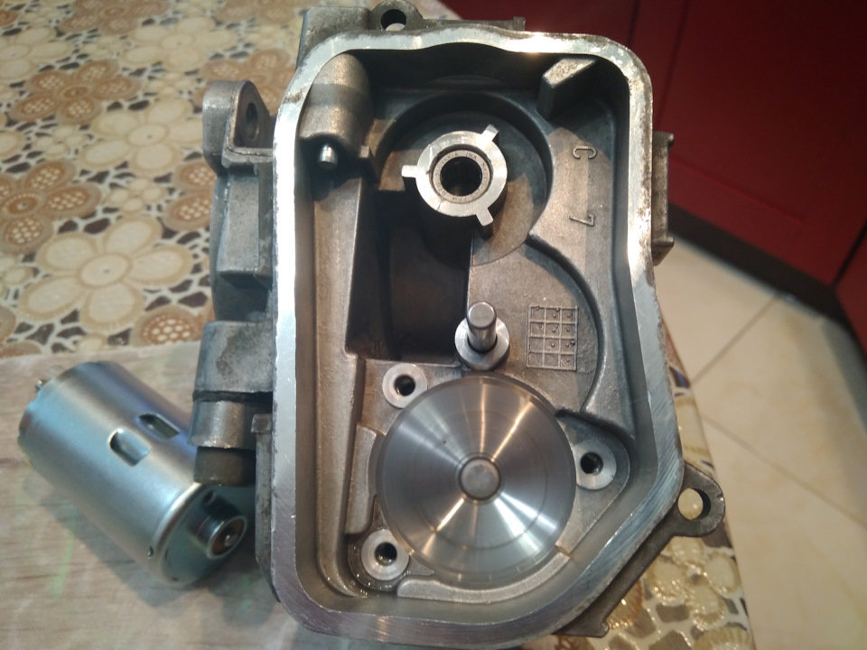 Для начала снимаем гофру (две шпильки под головку на 10), затем отворачиваем два болта с внешним торксом на 10 и отсоединяем часть заслонки с прокладкой от основного корпуса. Отворачиваем два винта, крепящие саму заслонку к оси и извлекаем её. После этого нам необходимо извлечь ось заслонки вместе с чёрными шестернями, ось держит металлический штифт. Чтобы к нему подобраться, нужно высверлить заглушку сверлом на 3 или 4 мм.