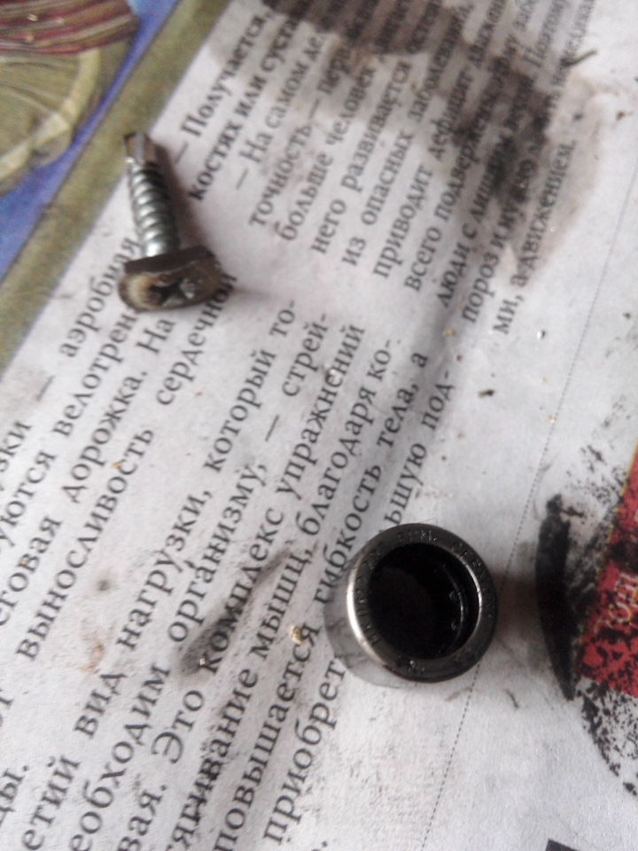 6. Подшипник просто выбивается винтом-саморезом с широкой шляпкой, чуть сточенной с двух сторон болгаркой или напильником. Убираются резиновые колечки-сальники из подшипника, вставляется в подшипник саморез и выбивается с обратной стороны через походящую выколотку