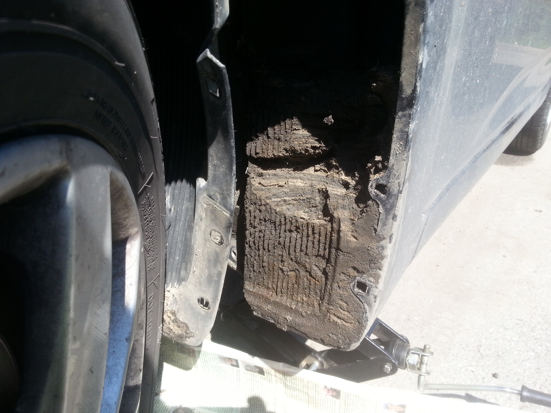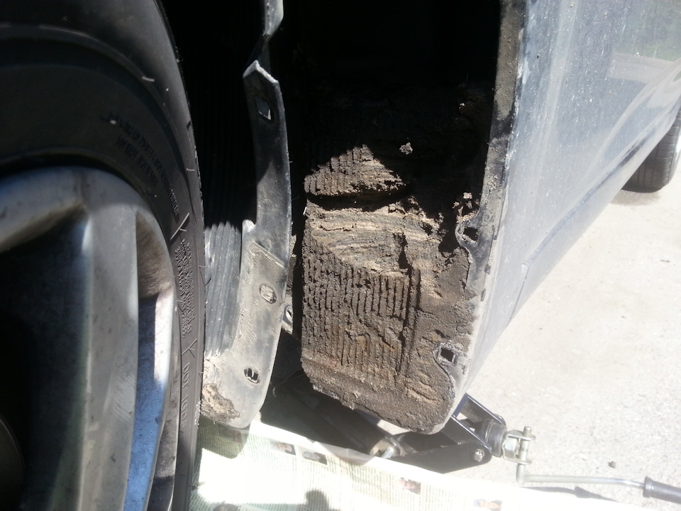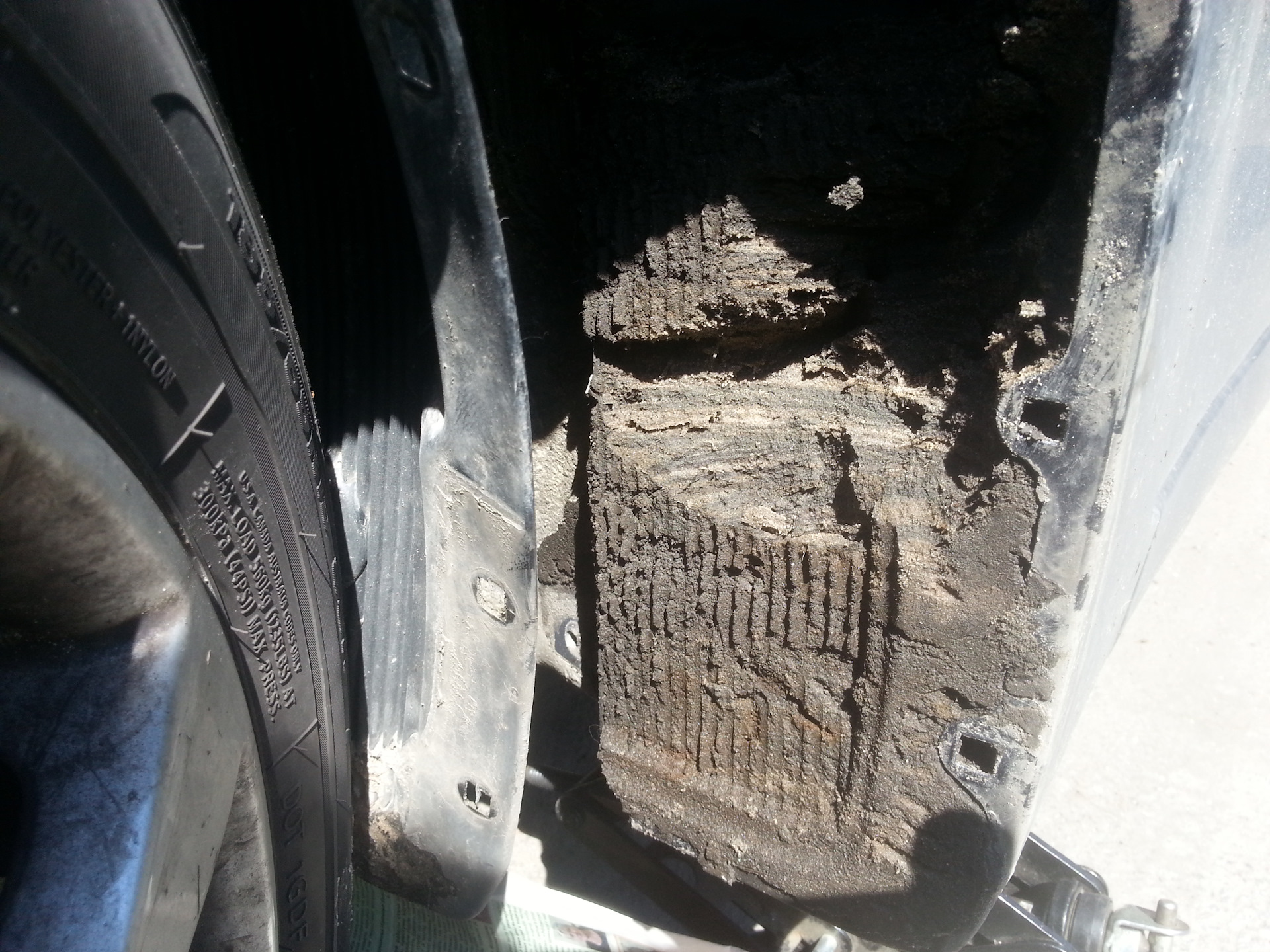 Пока "профессора масляных наук" троллят читателей D2, я решил посмотреть, что же творится за локерами передних крыльев. Прошло 4 года и это было первое "открытие". Картина открылась плачевная — все плотно забито землей! (фото 1, 2). Пришлось с помощью подручных инструментов выгребать землю — в итоге получилось по 3-4 килограмма с каждой стороны! Все вымыто при помощи ручного пульверизатора и высушено — летнее солнышко способствовало этому.(фото 3, 4)