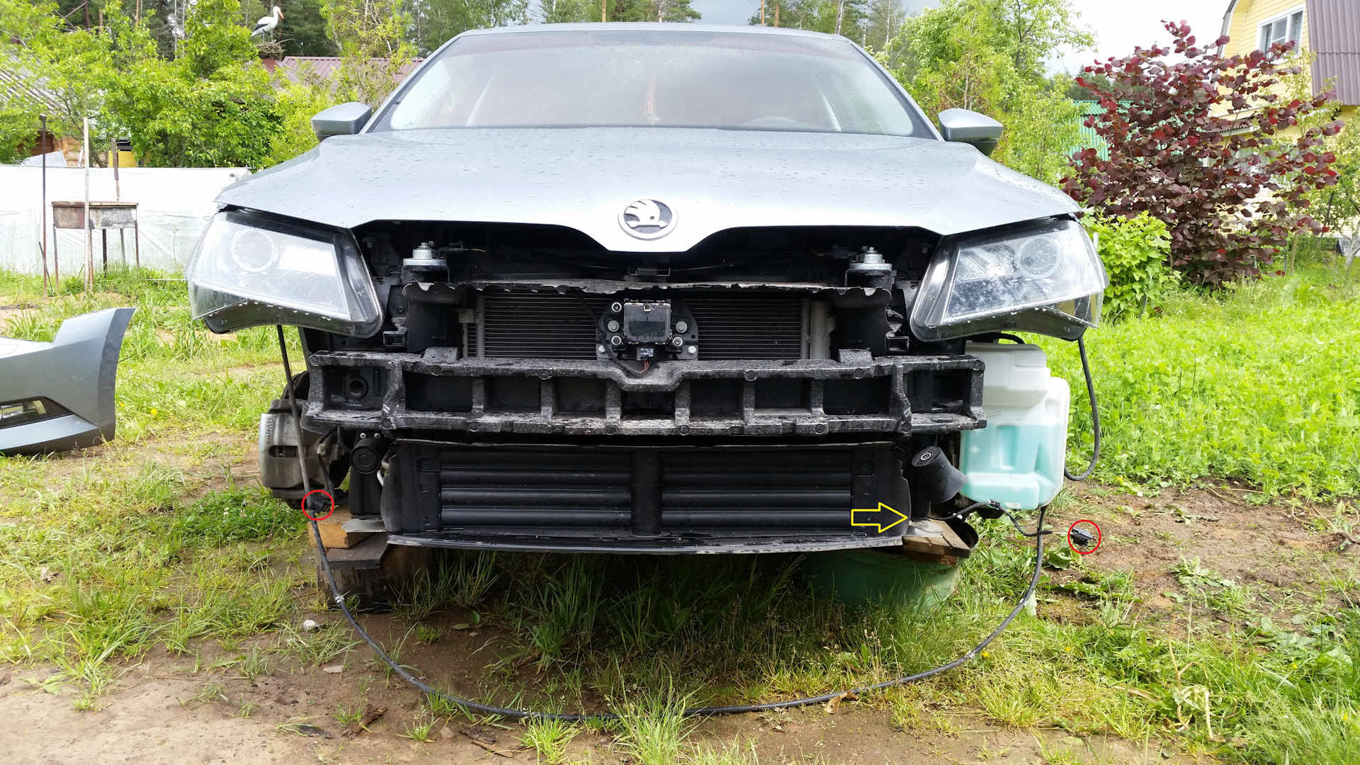 б). Отсоединил шланги от форсунок омывателя фар, фишки от противотуманок (отмечены красными овалами на фото), фишку датчика температуры окружающей среды (находится примерно в районе жёлтой стрелки)