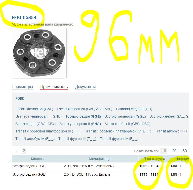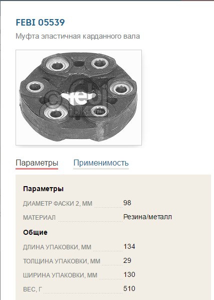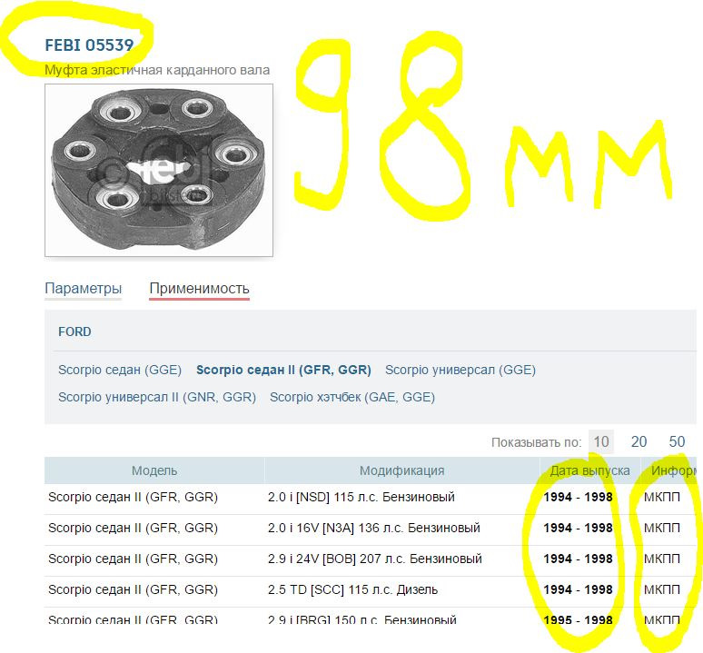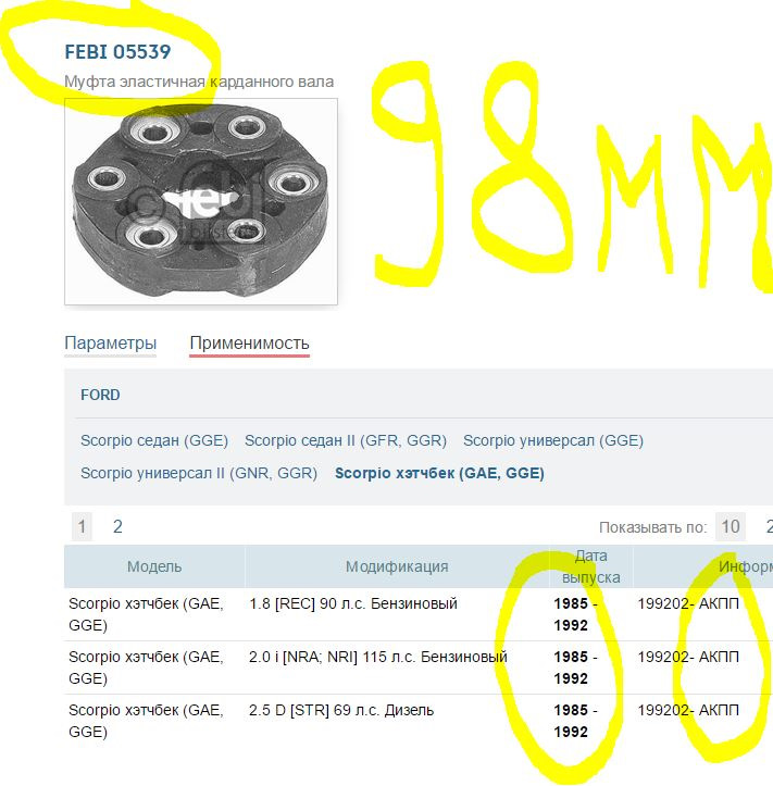 если пробивать по оригинальному номеру запчасти для Scorpio 1994-1998 — Ford 155603215, то по FEBI выдает код 05539 — и это муфта GAF 43! В описании видно, ДИАМЕТР ФАСКИ — 98 мм. Это так обозначается межосевое расстояние втулок.