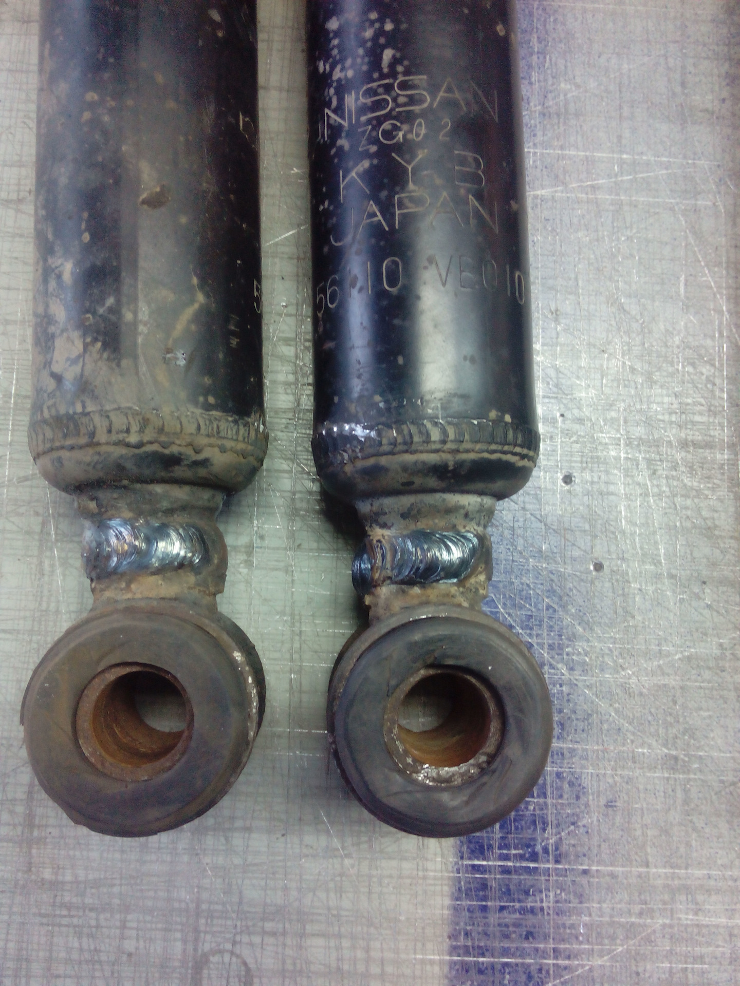 Решил попробовать еще один способ. Установить передние амортизаторы от NISSAN SAFARI . Трабл в том, что крепления у него шток-шток, и необходимо было что то колхозить. Колхозить мы любим, и поэтому в путь! Отрезаем штоки, и варим ухи)) По длине совпадают с прадиковскими.