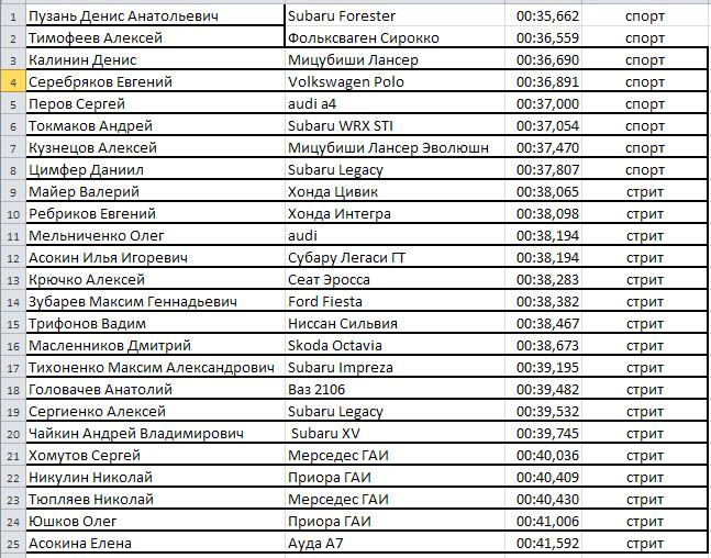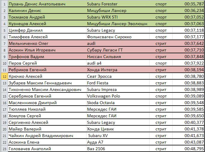 Далее правлю таблицу, и получаем то, что мы в классе "стрит" и у нас время близко к границе в 38 сек. А все кто быстрее это "спорт". Ничего про то, как нас распределяли, никто из обычных участников не знал. Ведущий тоже ничего не объявил.