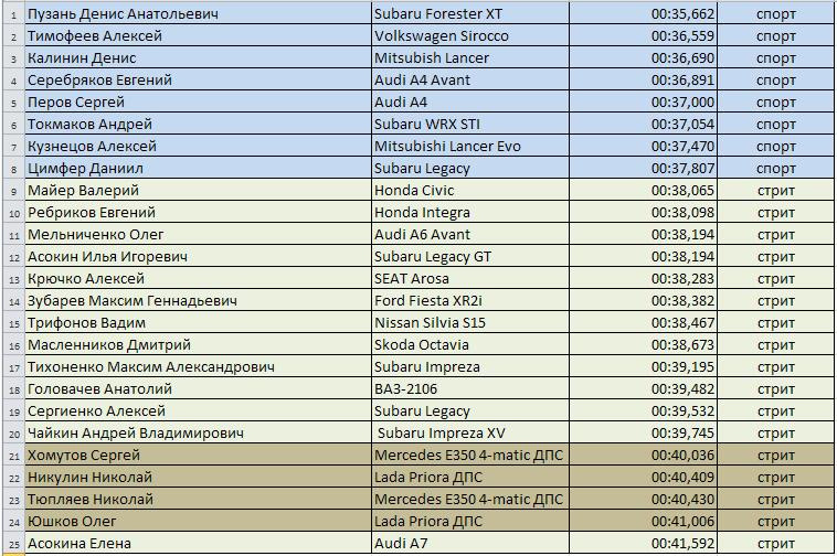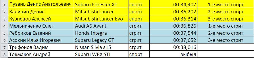 Далее по итогам 1-го заезда, некоторые участники проезжают быстрее чем 38 секунд, однако, минуя регламентные правила различных автомобильных соревнований, остаются в классе "стрит", хотя по общепринятой практике должны перейти в "спорт". Но тут как говорится, своих обижать нельзя, а то без кубков останутся)))