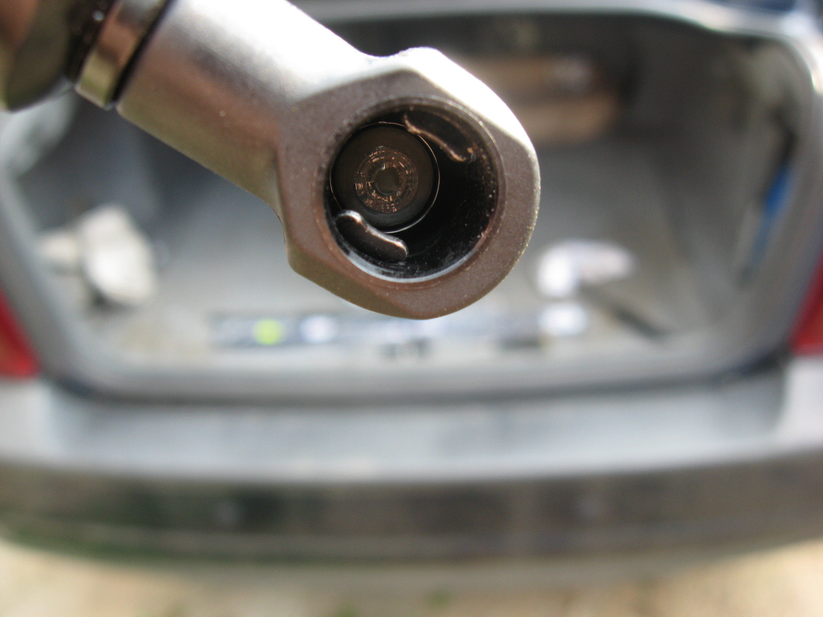 Трубка идёт через отверстие в днище багажника с резиновым уплотнителем и выходит на улицу.
