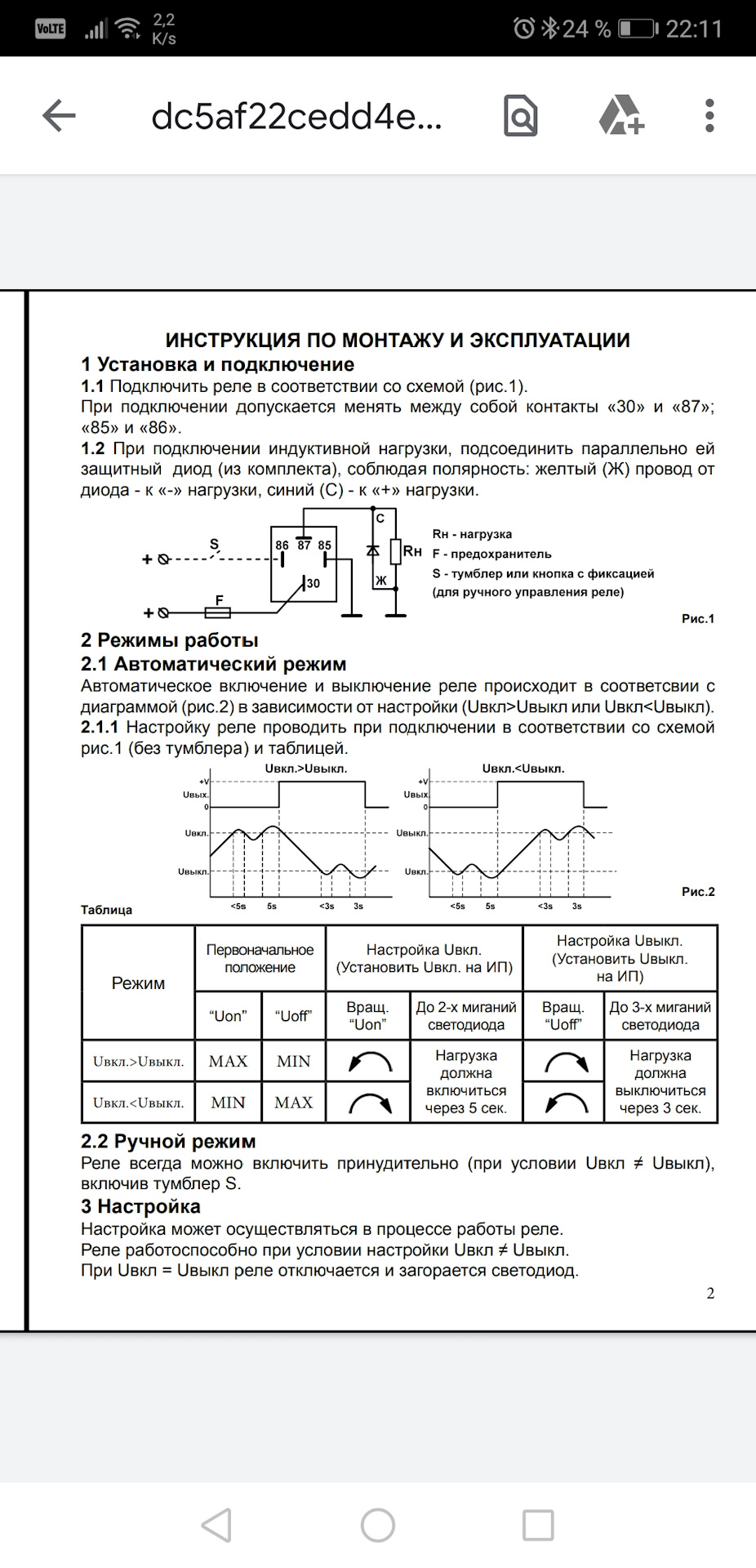 данное реле настраивается на два напряжения, отключения и включения, у меня при напряжении откл, мигает 3 раза диод, он находится в реле, и оно гасит потребитель, при напряжении вкл, два раза мигает диод, и оно вкл потребитель, но и то и и то происходит не сразу, а секунды через 2 или 5, если не ошибаюсь