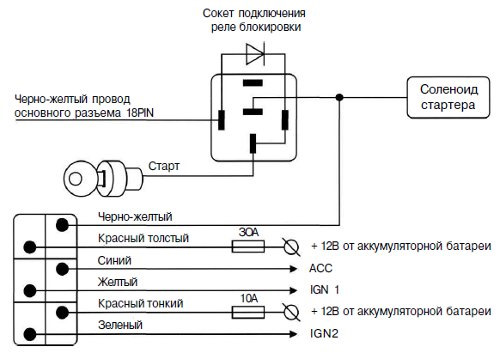 идем разбирать рулевую колонку видим красный провод на котором появляется +12 в положении стартер режем его попалам и подключаем в разрыв реле которое было в комплекте…, сине/черный провод это провод на котором появляется +12 в положении зажигание вкл и не пропадает в положении стартер. к нему подключаем 2 провода синий и желтый провода. ну а далее по схеме…кстате схема для подключения блокировке стартера нарисована правильно только провода как на схеме уже надо соединять самому.и диод так же надо будет покупать и подключать все так же как на схеме(я думал эта схема внутри реле)ну оказывается это просто стандартное реле.ну а красный провод основной +12 там тонкий и толстый я подключил в блоке предохранителей к самому большому предохранителю 50А.только подключил до предохранителя чтоб даже если предохранитель сгорит чтоб всегда была машина под охраной.