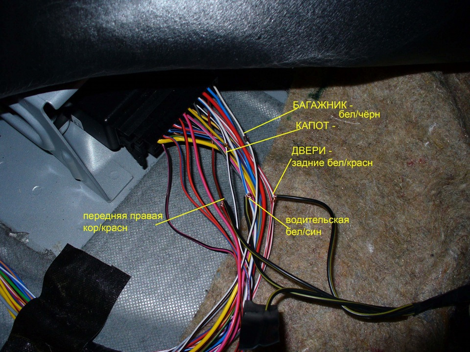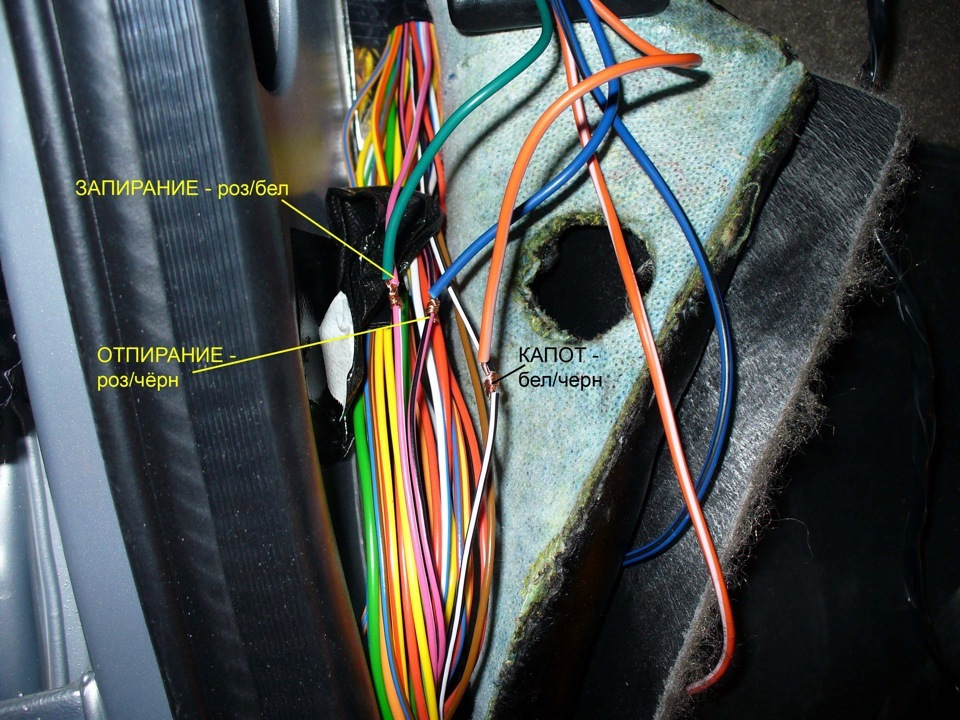 так теперь тут надо внимательно берем в руки колодку центрального замка там 6 проводов и ищем в пороге розово/белый и розово/черный провода смотрите чтоб они были одинаковые по толщине так как там есть еще один розово белый провод чуть толще.я определил мне нужные только по толщине.главное чтоб одинаковые были…и так у нас управление центр замком негативное т.е минусом. подключаем по схеме 4 т.е к розово/белому подключаем синий провод ц.з