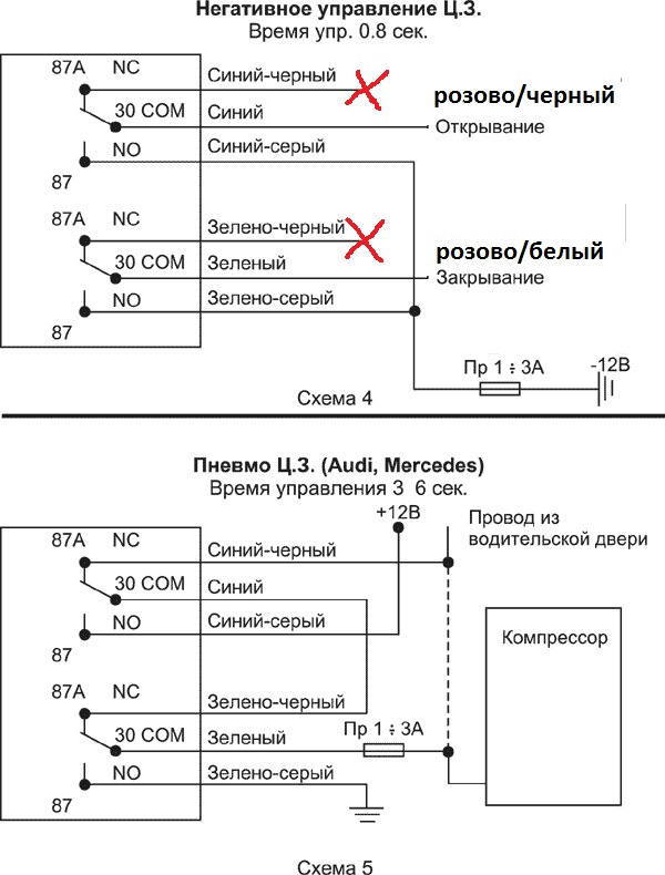 к розово/черному подключаем зеленый провод ц.з и как на схеме соединяем зелено/серый и сине/серый и через предохранитель кидаем их на массу.
