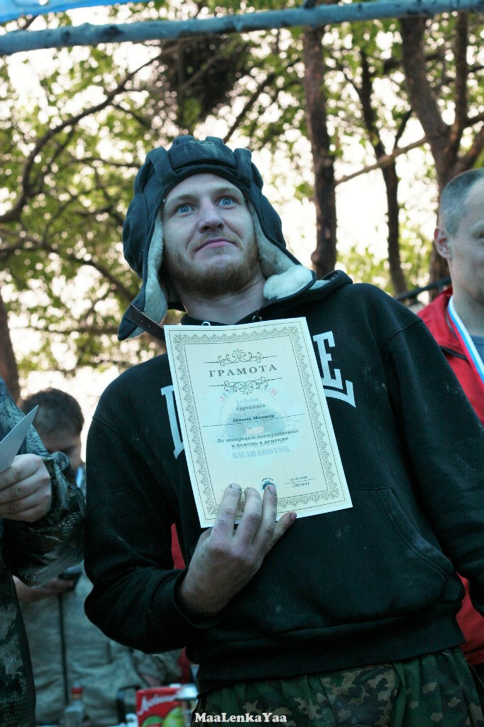 В 12:00 Добрый собирает всех на награждение. Мы — третьи в Спорте! Класс! Ступенькой выше нас, на 2м месте — Евгений Перевалов (Прайд) (Штурман — Виктор, Председатель Паджеро-Клуба). Ну а первое место, конечно же, досталось Пилоту ЛапоКрузера Сергею Зубову. Почему "конечено же"? ;) Да хотя бы потому что клиренс у него 65см… Точки, в которых нам для взятия надо было окунаться в воду по грудь — он брал не напрягаясь, даже не выходя из машины. Просто вытягивая руку из кабины!