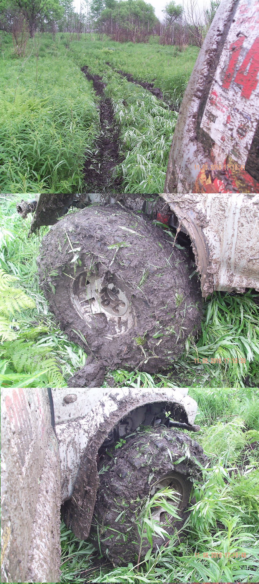 Так, не сильно напрягаясь взяли еще пару точек и по полям дошли до "Авторадио". В этом месте нас поджидала первая потеря… Как и большинство предыдущих, точка стояла посреди болотца, с уже привычным, топким дном. Но вход на точку — по травяному ковру. Порвешь его — и колеса попадут в капкан. Придется его резать до самого выхода из болота или сэндтраки доставать. А это — время… Но, зашли аккуратно, спокойненько взяли, на выходе пришлось немного лебеднуться и вроде все. Двинулись к следующей и тут — "ХЛОП!"… Руслан обращает внимание на то что руль начинает сильно тянуть вправо, как будто левое колесо накачано сильнее правого. Но как? они ведь у нас оба до 0,3 спущены! Выходим. Замеряем давление. В правом то норма, 0,3, а вот в левом — почти единица! Что за дела? замеряем давление в тайерлоке. Тоже единица! Блин. Раз давление в колесе и в тайерлоке равное — к бабке не ходи — звиздец тайерлоку… Жаль. Очень жаль. Он должен был защищать нас от разувания, а теперь… Ладно, будем аккуратнее.