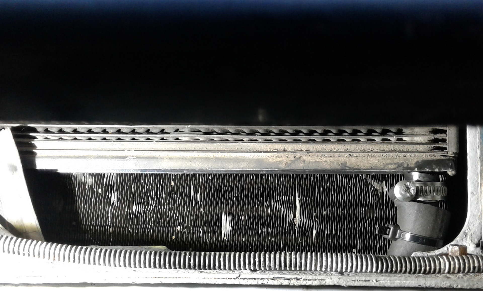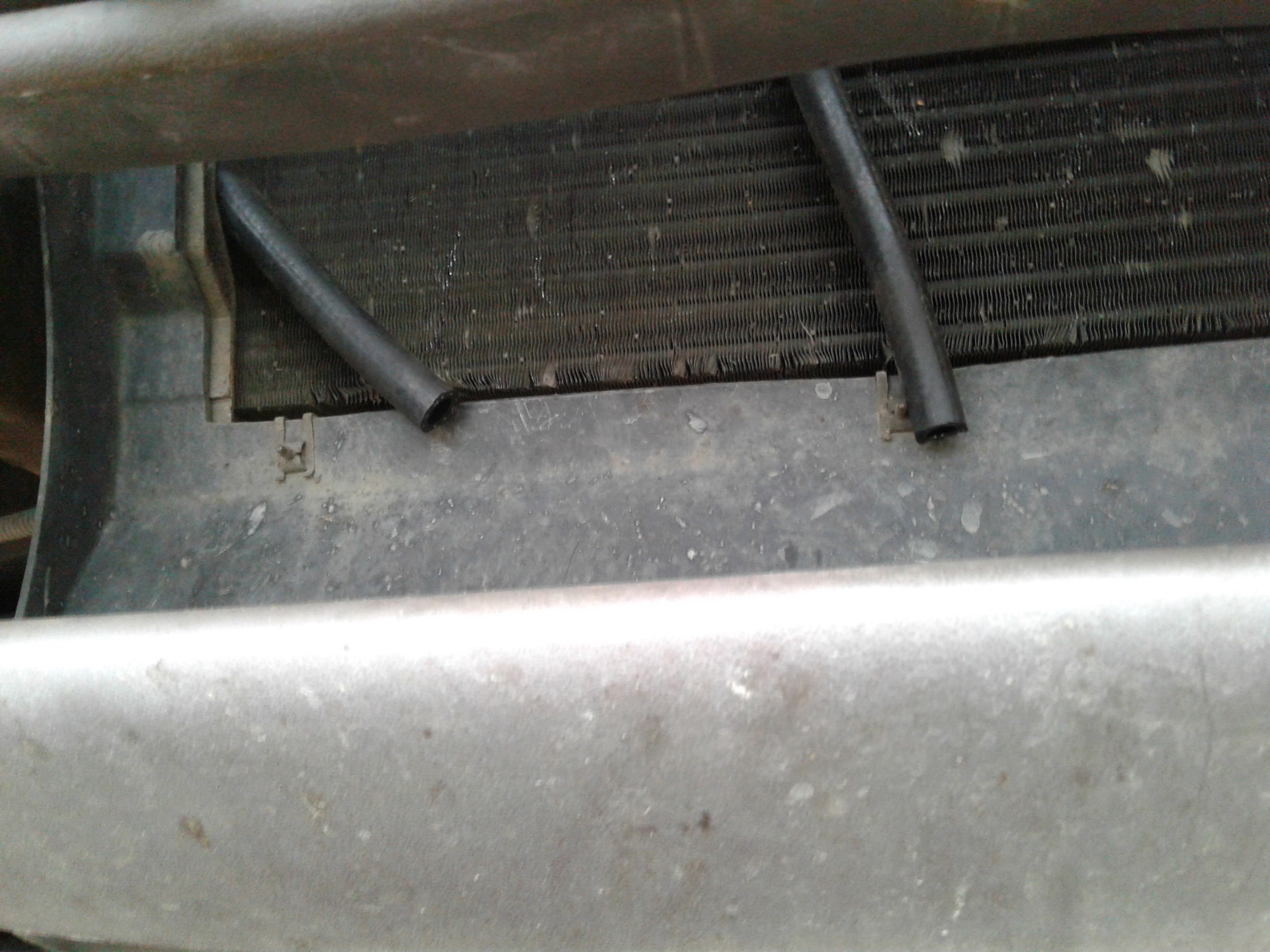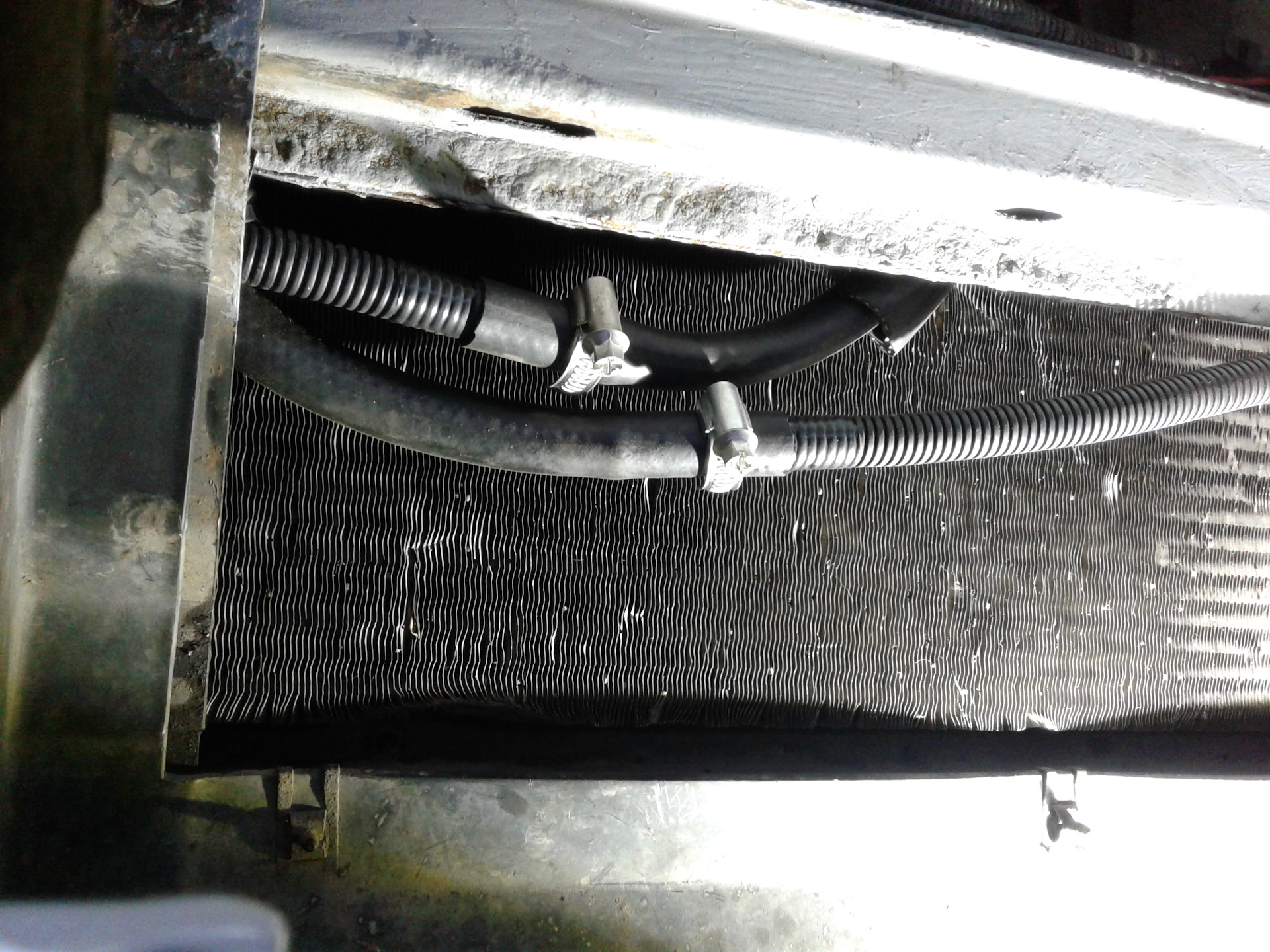 Получается что правый (по ходу движения) шланг закрыт телевизором и просто так его не заменишь — надо снимать радиатор. Но все же я решил пойти именно на такое размещение радиатора ибо другие варианты мне ну совсем не понравились.