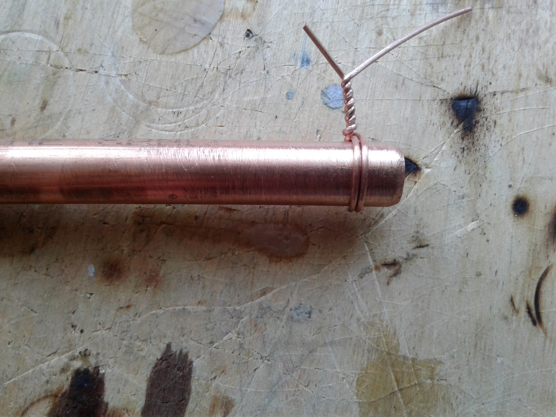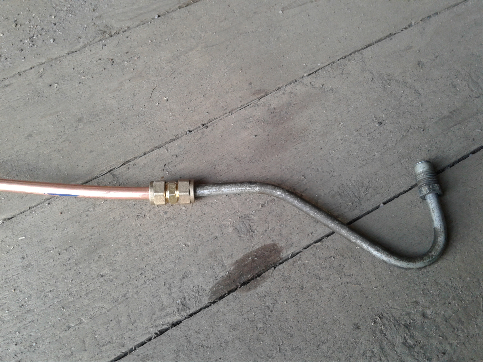 Так что после установки радиатора я взял в руки проволочину и из нее сделал макет-образец как надо согнуть-спаять медные трубки для соединения со штатными. К слову сказать, гнуть не пришлось — только паять. Паял дома газовой плитой + паяльником на 80Вт.