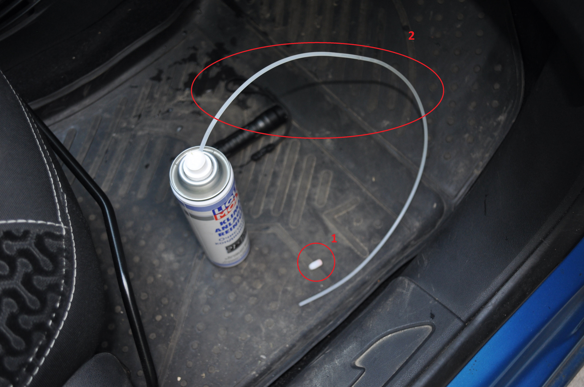 5) Одеваем красный шланг слива конденсата на шланг ликви моли, Просовываем конструкцию к испарителю примерно на 2/3 шланга (если войдет только на 3-4см — значит вы уперлись в ступеньку и нужно подергать шланг) одеваем внутренний конец красного шланга на слив конденсата и начинаем разбрызгивать окуратно держа второй конец красного шланга над тренажем т.к. рано или позно из него польется вся эта гадость…