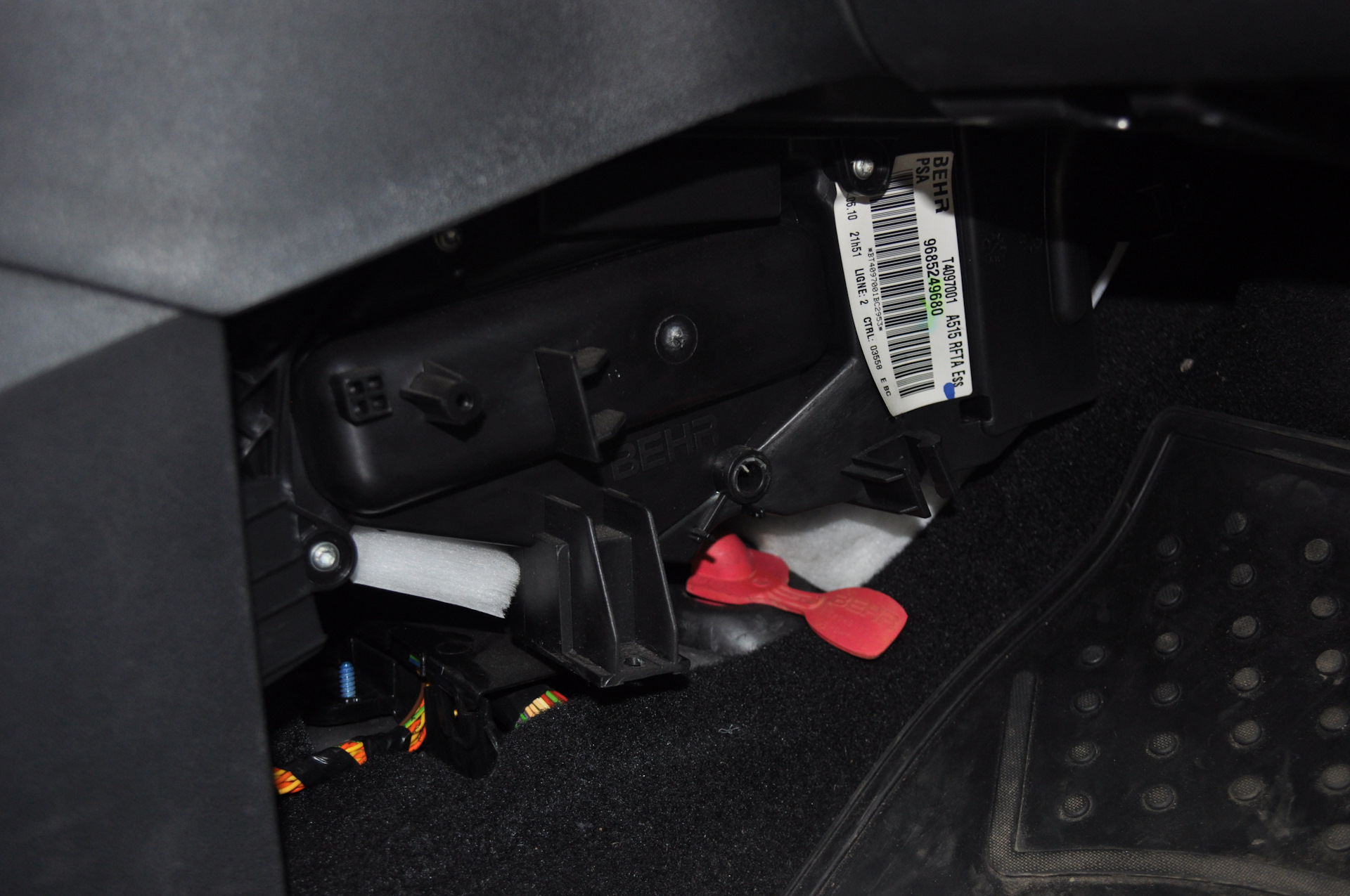 3) Видим красный, резиновый шланг с язычком (см. фото ниже) — это дренаж для слива конденсата. Тянем за язычек и вынимаем шланг со стороны слива, потом нащупываем конец шланга со стороны испарителя и тоже снимаем (зачем станет ясно из пунктов 4 и 5. Если вкратце — вкратце иначе не подлезть к испарителю)