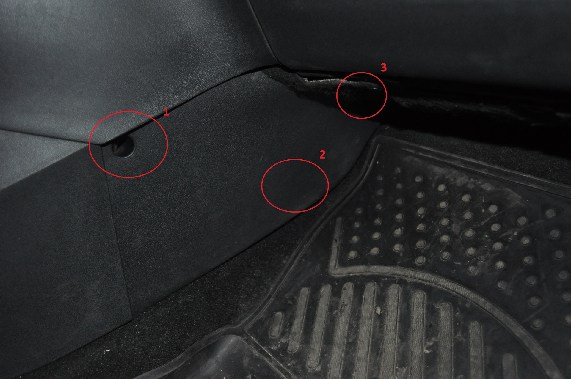 2) Со стороны пассажира находим панель под бардачком со стороны центральной консоли как на фото ниже. Откручиваем звездочкой на T10 болт обведенный красным овалом под цифрой 1, и отдергиваем 2 клипсы, которые находятся с обратной стороны в районе овалов 2 и 3 (см. фото ниже)