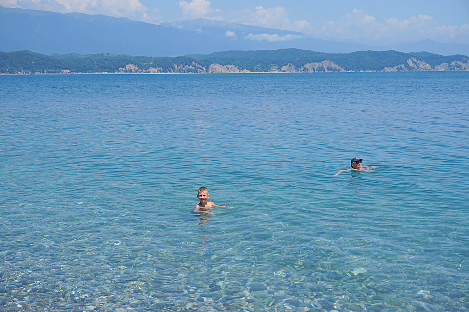 До Абхазии ближе будет)) Нам очень понравилась в Абхазии. Планирую теперь туда поехать отдыхать. По ценам: мы жили в Адлере, у реки Мзымта (до Сочи арена 3 остановки на автобусе, до моря мин. 10) номер 4-х местный (нас трое) двухкомнатный с кондеем, телевизор, холодильник, Wi-Fi, парковка, для детей бассейн во дворе (воду каждый день меняли) за 2600 в сутки. На фото — море в Абхазии