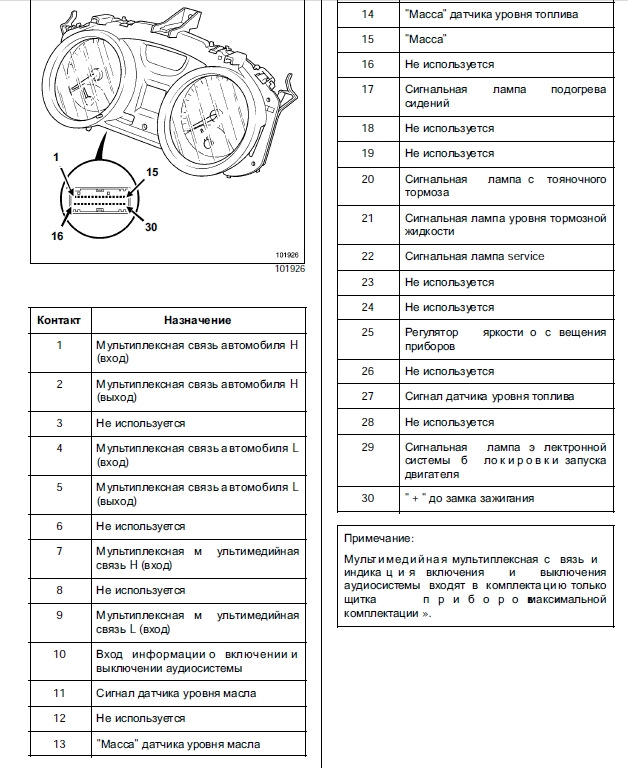 При выключенном зажигании нажмите на кнопку вывода информации бортового компьютера и, удерживая ее нажатой, нажмите на кнопку запуска двигателя и удерживайте ее нажатой примерно в течение 7 секунд. Щиток приборов при этом переходит в режим самопроверки. Во время самопроверки при каждом нажатии на кнопку вывода информации бортового компьютера на экране последовательно появляются: "Mode test", версия программного обеспечения, возможные присутствующие или запомненные неисправности, значение сопротивления датчика уровня топлива, значение расхода топлива и "Test OK".