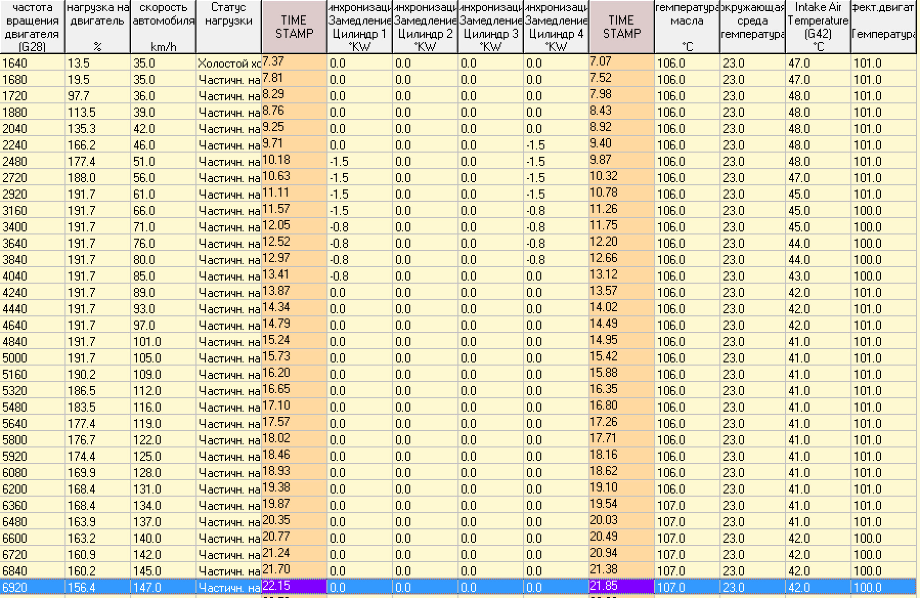 Глядя на свои логи могу заметить, что есть смысл сперва проехаться полкилометра без втапливания, чтобы разогнать жару из-под капота, а потом уже начинать замерять. А то у меня получилось 107 градусов масло после отжига и 56 на впуске, проехал метров 100 и начал жарить…К концу замера он как раз более-менее остыл))