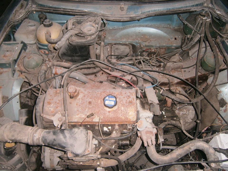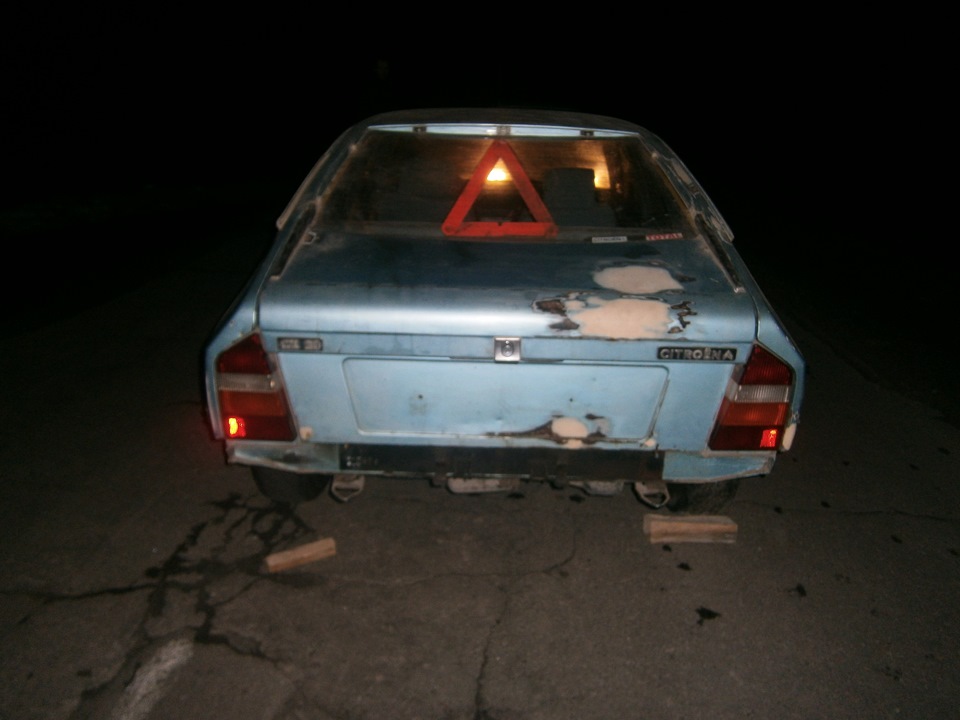Все уже решено, позвал одного знакомого, который с нами поедет, и втроем с супругой двинули за моей мечтой. Выехали под вечер, с полным баком, проехав 455км долили до полного, отлично! Всего 24 литра, расход чуть больше 5-и радует) И тут дорого пошла с такими ямами… Даже не знаю, местами это были окопы для стрельб из лошади стоя! Это еще пол беды, подъезжая к Хмельницкой области попали в туман и дождь, позаливало все ямы и погнули мы аж 4 диска! Туман тоже странный был, кусками лежал на дороге. Едешь сквозь эти тучи, справа лес, слева лес… не хватает лишь появления маленькой девочки с плюшевым мишкой на дороге, жуть какая-то! Кое как все же добрались мы до места назначения в 4 утра… Выспались и двинули за СХ! Дорога все та же, по пути я мысленно представляю, как мы будем тянуть по этим дорогам ситроена… Все ж добрались мы, встречаемся с человеком, эдакий «совладелец», так как человек с которым я разговаривал по телефону уехал. Заходим в темный гараж (барабанная дробь) в глубине которого стоит этот «тунец» в слое пыли, он уже не синий, а просто серый. Следы кошачьих лап по всему кузову, особенно хорошо видны на стекле. Валентин (знакомый мой, который из Хмельницка) открывает капот, откуда показывает морду та самая кошка облюбовавшая этот автомобиль. Заглядываю под капот, много проводов оборвано… По кузову, зашпаклеванный. Но не сильно, видно там, где начинал подгнивать, двери целые, пороги тоже, Заглянул в багажник ( еще и с электрическим замком @_@) следов нету. Поснимал обшивку, чисто! Внешне же, все фары целы и все на месте, не хватает «клыков» на переднем бампере и заднего бампера. Позже они были обнаружены в машине, вместе с снятыми дверными картами. Стекла целы, лишь лобовое треснуто и то, в углу нижнем. Друзья смотрят, как низко он лежит (я не предупреждал о таком :D), успокаиваю, что знаю как его поднять. Все же они переспрашивают (в глазах читается ужас)