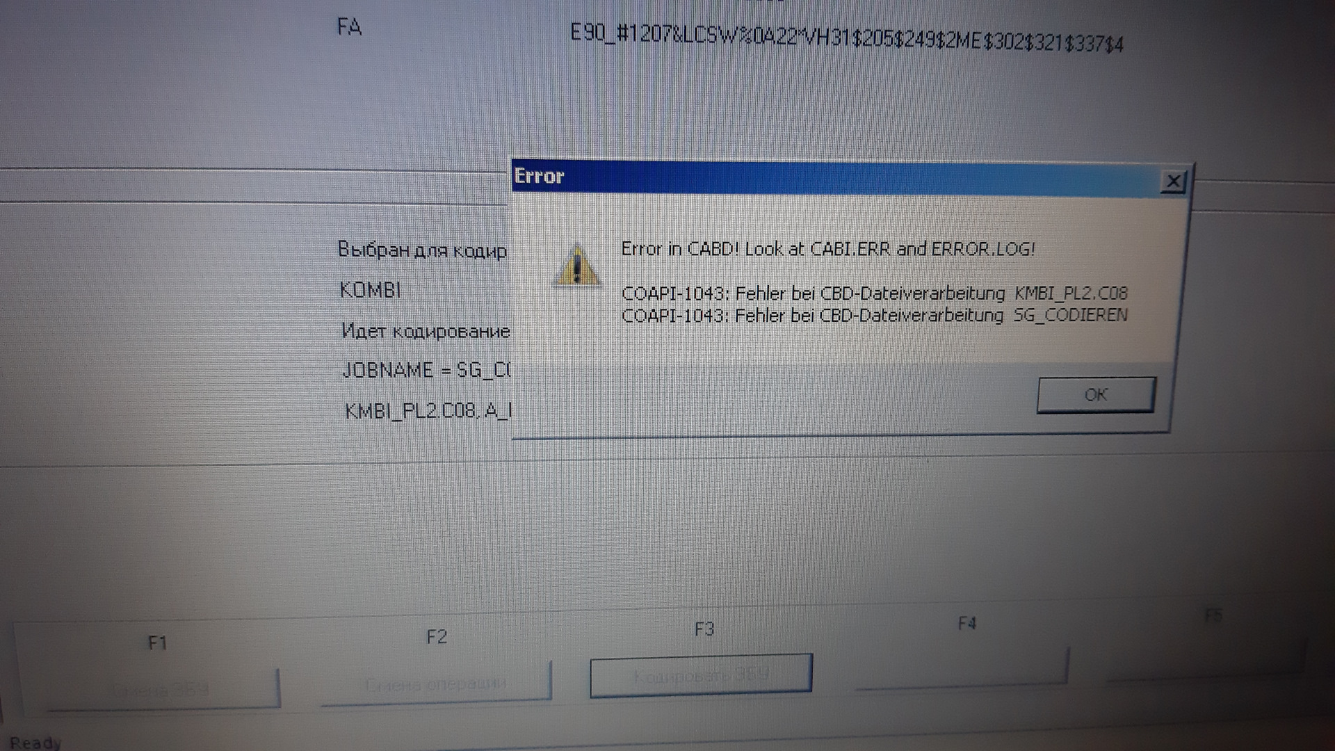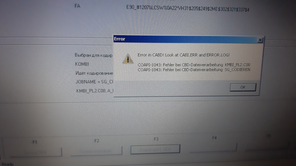 — считываем наш ZCS из ЭБУ, например EWS, выбираем наш блок LCM, выбираем операцию "SG_CODIEREN", нажимаем "Кодирование ЭБУ", при этом пройдет кодирование под шифр ZCS комплектации и оборудования авто. При выполнении операции кодирования, будет такая ошибка: