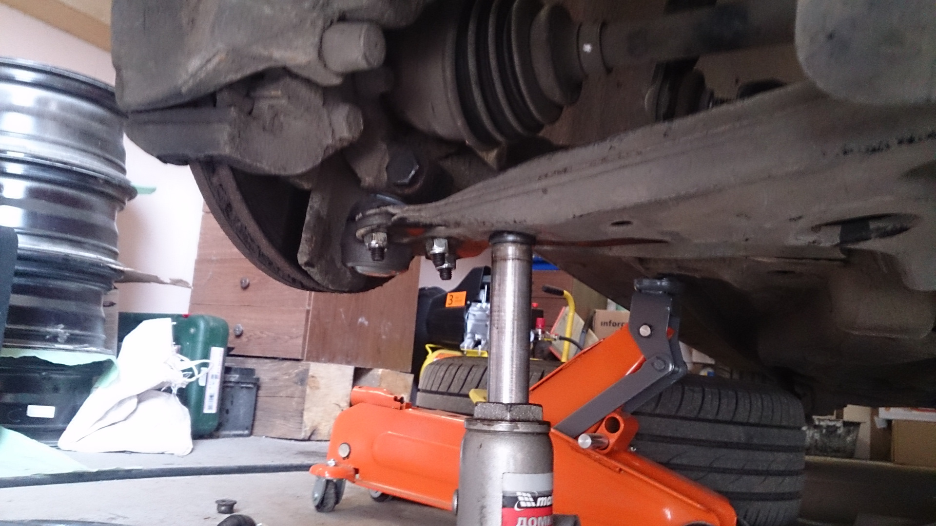 Используя второй домкрат ставим его в выемку в рычаге и домкратим для удобства снятия стойки стабилизатора.