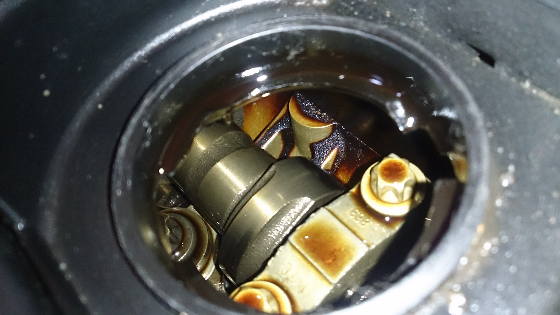 Решил я сменить свое халявное масло 10W-40. Залил я его на пробеге 102586. И к 105620, т.к. спустя всего 3034 км или всего 130 моточасов оно по виду стало жутким по цвету. Хотя судя по фоткам через заливную — особо оно старые какахи не отмыло…