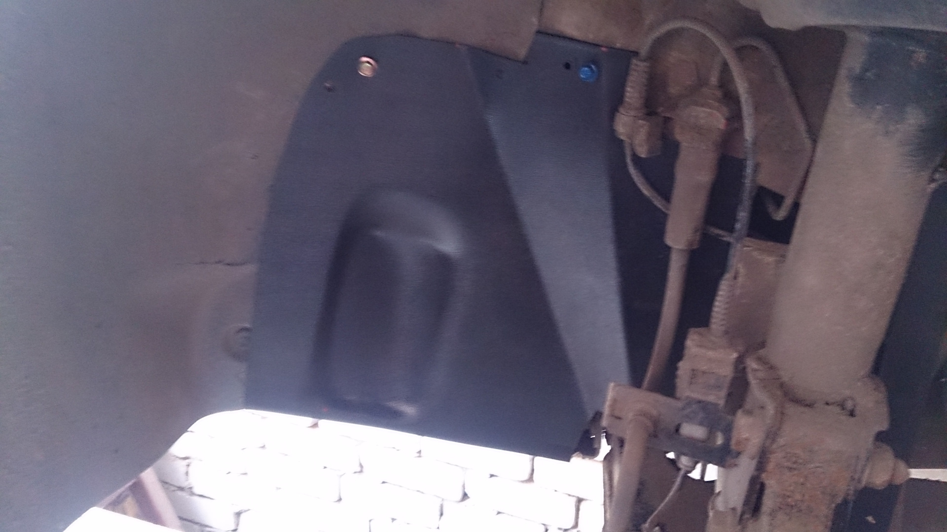 Ну и пользуясь тем, что машина на домкрате, колесо снято — ставим наконец последнюю защиту от MadSaray . Пришлось по месту немного подрезать ножом. Но встала она отлично.