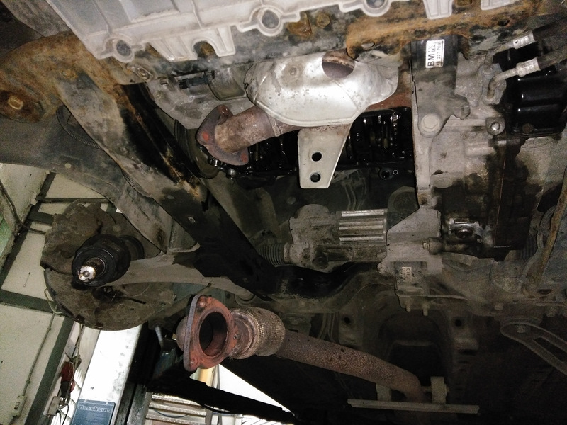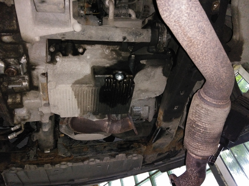 Для начала скажу, что разбирать надо половину правой стороны машины, чтобы снять поддон картера. Снимается выхлопная труба, привод и много по мелочи. Сливается жидкость АКПП, ибо при вытаскивании привода оттуда будет выливаться. Это тоже к плюсам — сразу залили новую жидкость АКПП вместо старой, получилась вторая частичная замена.