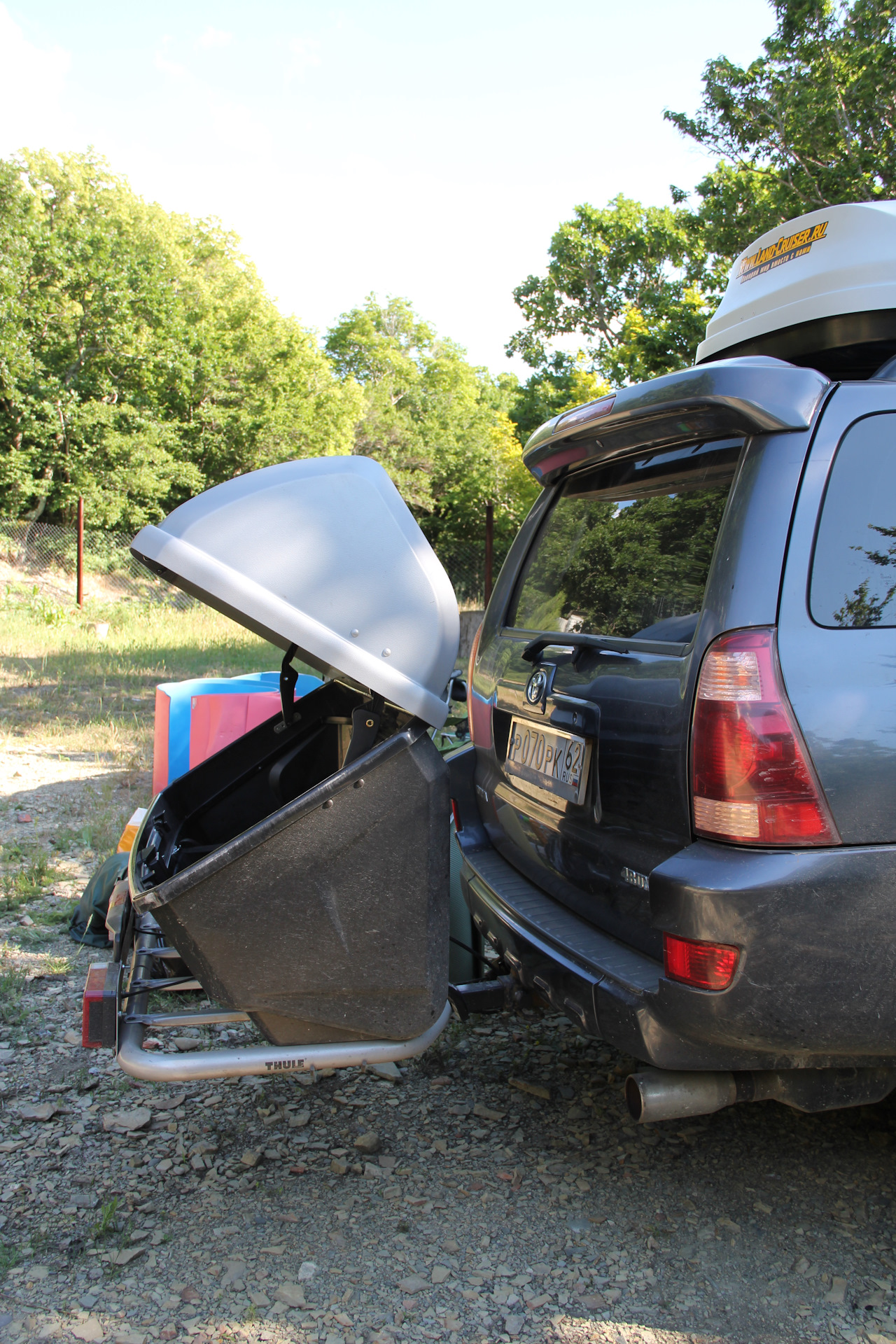 Этим летом я решил реализовать свою давнюю мечту — постоять на море с палаткой. Пока дети были мелкие постоять не получалось, хотя 2 года подряд палатку и спальники возили с собой :-) Но в этот раз нацелились именно на палатку, так как дети подросли (3.5 и 6 лет), и организовался на родном форуме land-cruiser.ru форумный кемпинг в Малом Утрише с душем, туалетом, электричеством и холодильником! Такую возможность решили не упускать и стали собираться. Вещей набрали очень много: много одежды для детей, большая кемпинговая палатка 12 кв.м., которая занимает целый чемодан на колесиках, 2 стола, 4 стула, газовая плита и прочее. В Раннер это всё не влезало :-( Думал уже брать прицеп у кого-нибудь, но брат подсказал, что у нашего форумчанина Глеба есть бокс на фаркоп, что намного удобнее прицепа. Созвонились с Глебом Gleb501, и он мне дал покатать данный бокс Thule BackUp 900, за что ему ОГРОМНОЕ спасибо!
