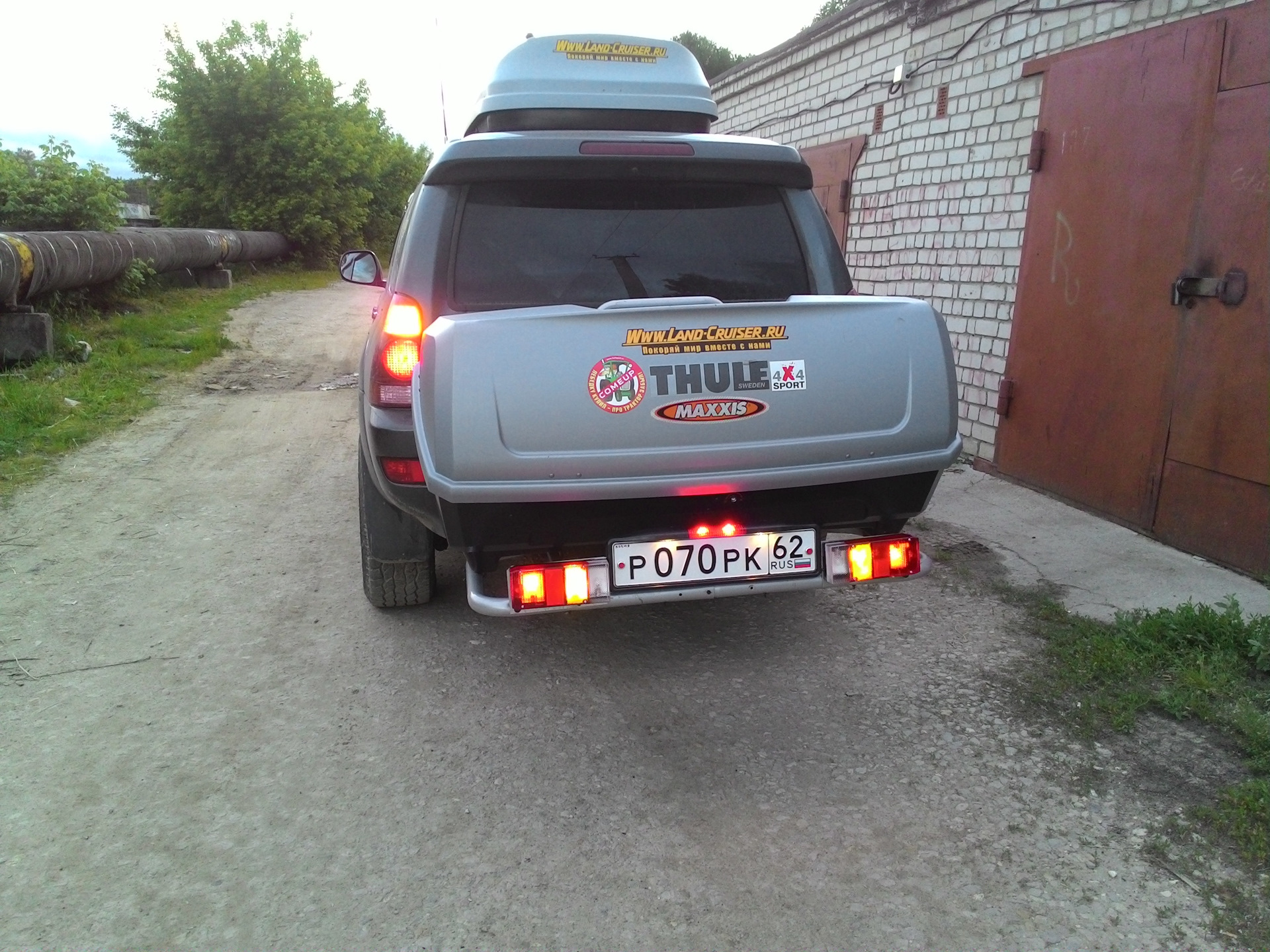 На данной платформе находятся стопы-поворотники-габариты и рамка с подсветкой для номерного знака, так как груз на платформе перекрывает номерной знак на автомобиле. Вся электрика подключается аналогично электрике фаркопа. Правда после внедорожных покатушек Глеба с данной платформой на Оранжевом Макасине торчащие ниже линии платформы плафоны и рамка номерного знака оторвались с корнями. И даже псевдозащита фонарей не помогла. Это же европейский вариант, для асфальта, а для российских реалий его нужно переделать, что я и сделал.