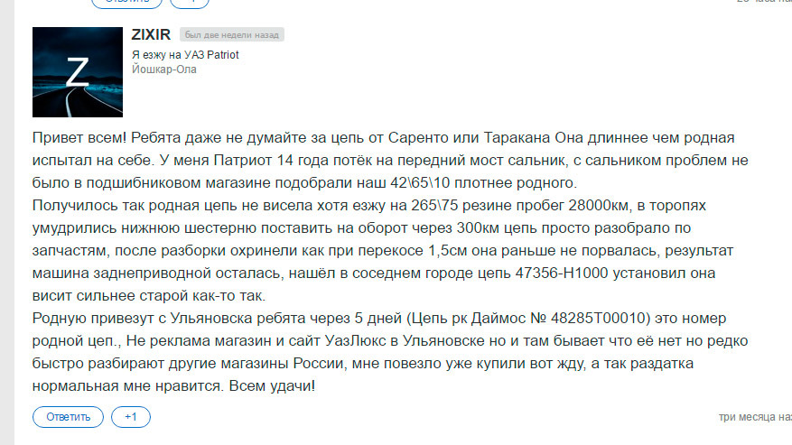 P.S. Ремонтировали цепь на Патриоте друга. Мой пока катает без нареканий. ^_^ Лично я всё же предпочёл подобрать корейскую цепь. Но в условиях экономии предложенный вариант тоже годится: если в процессе ремонта возникнут вопросы – пишите, ответим =)