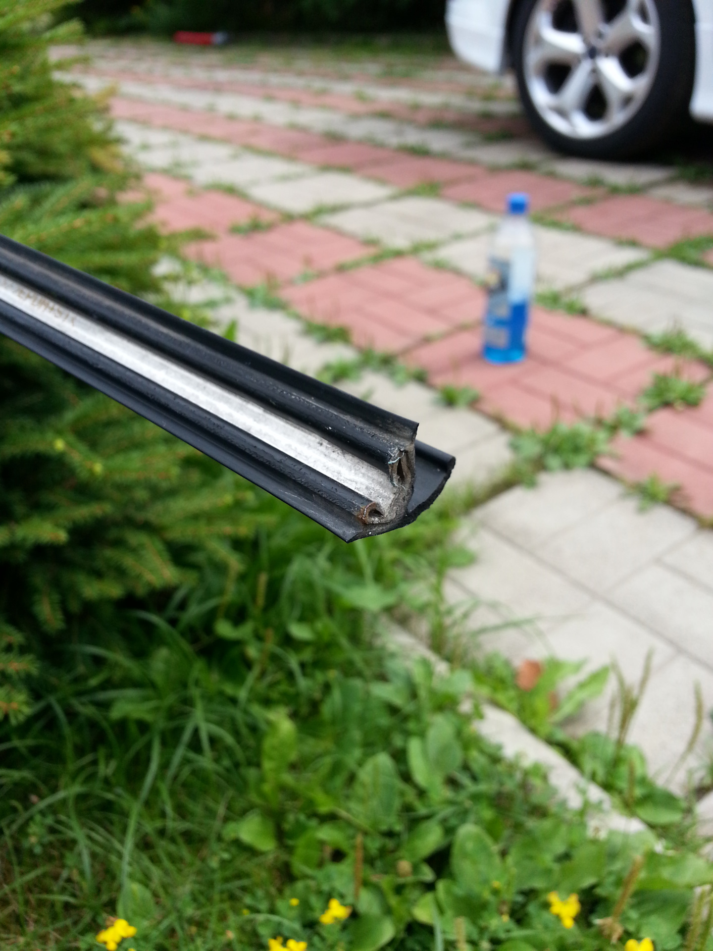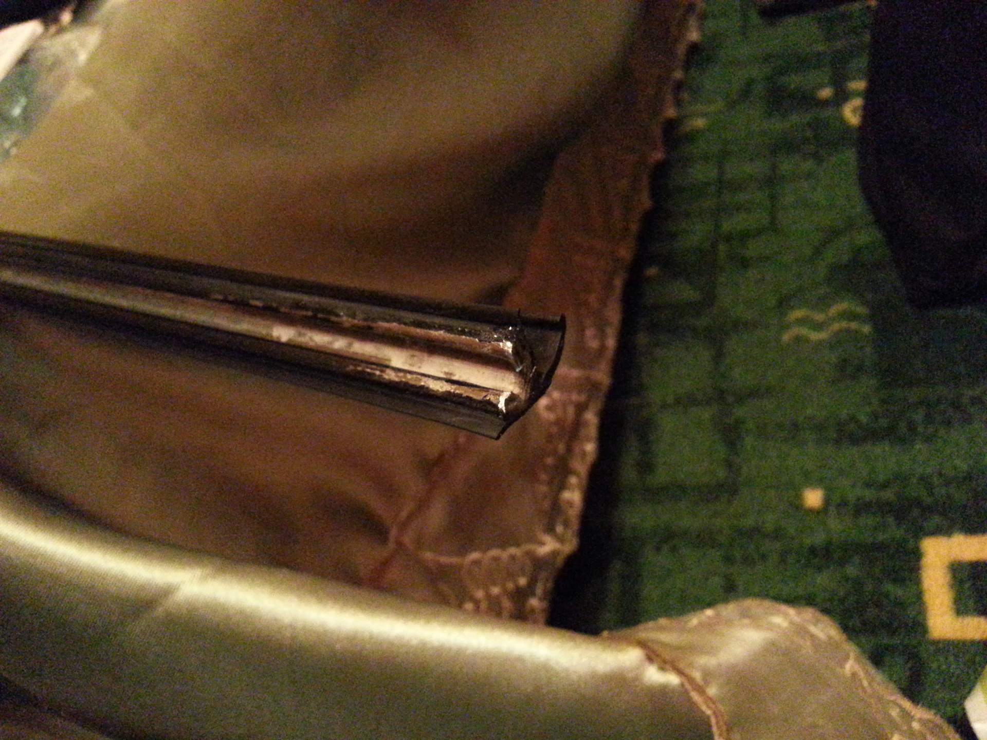 А вот и причина гадости: острый металлический заусенец в месте обреза стальной основы.Спилил, замазал оголенный металл Моментом Кристалл. Лучше для этого использовать силиконовый герметик черный, но на безрыбье…