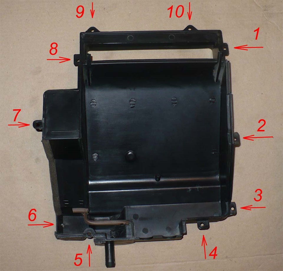 Справа, со стороны пассажира. Все разбирается. Откручивается 10 саморезов. Отгибается поддон кондея и именно на правую сторону — на сторону пассажира его можно извлечь.
