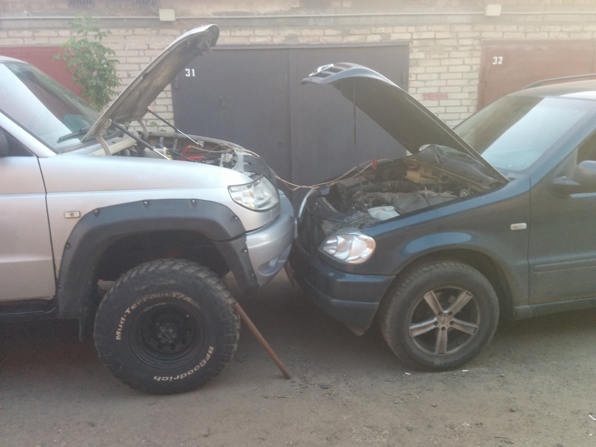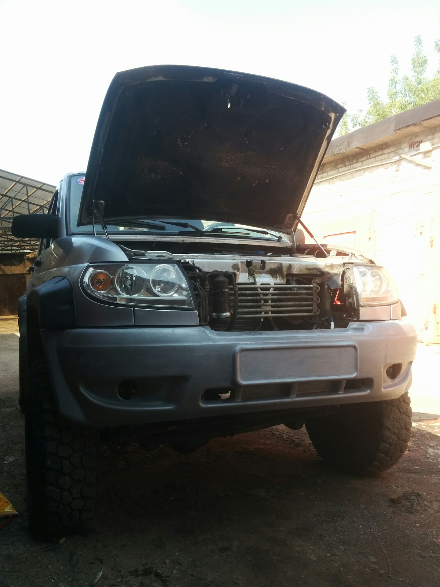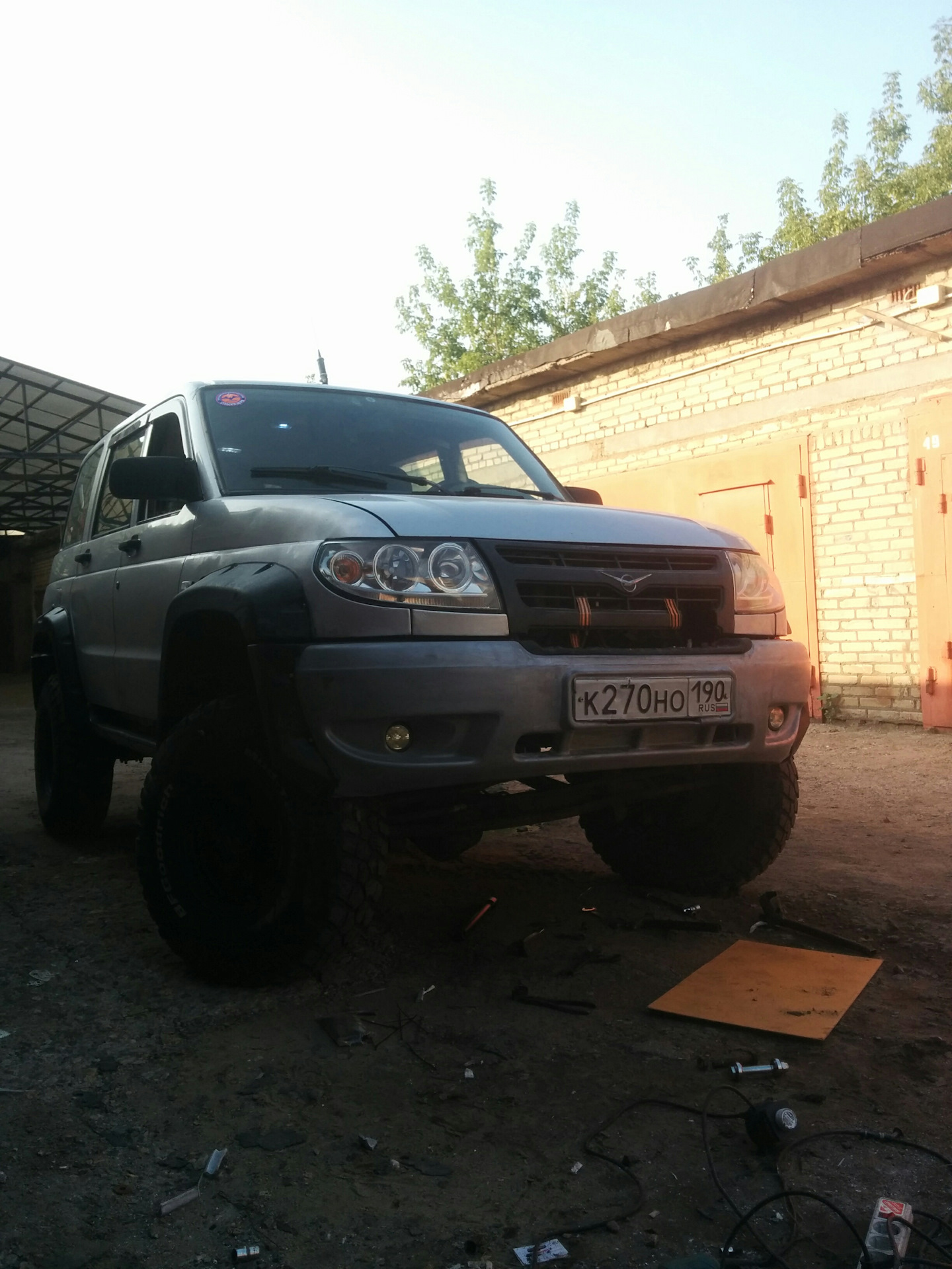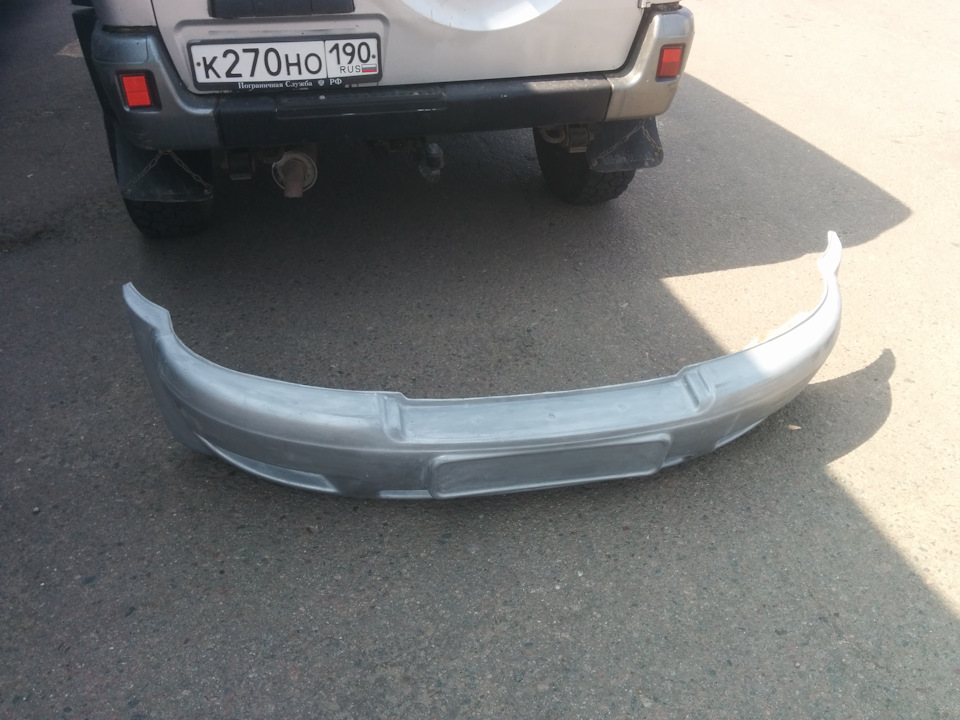 В связи с уходом в экспедиционный вираж и отсутствием необходимости возить лишние 60 килограмм на морде, мой автомобиль отбросил металлический силовик и почти месяц ездил с кривым белым штатным бампером, любезно подогнанным во временное пользоване комрадом Kovan. И вот наконец свершилось, приехал стеклопластиковый бампер в сборе с усилителем от Proexpert. Изначально он тоже правильного серого цвета, но Был покрашен кисточкой молотковой серебристой эмалью. До конца я не мог поверить в жесткость и монументальность конструкции. При весе в 16 килограмм он даже не сгибается при подъеме за него джеком. Материал похож на армированный преднагруженный бетон но обладает большей эластичностью. Вырезал (кстати пилится болгаркой или электролобзиком просто замечательно) за номером отверстие под клюз лебедки и пытался сломать этот кусок (толщина в том месте около 7-9мм) сломал ручку у молотка. В общем изделие своих денег стоит. Требую стеклопластиковые сенд-траки. Толщиной в 2-3 см они выдержат три уазика.