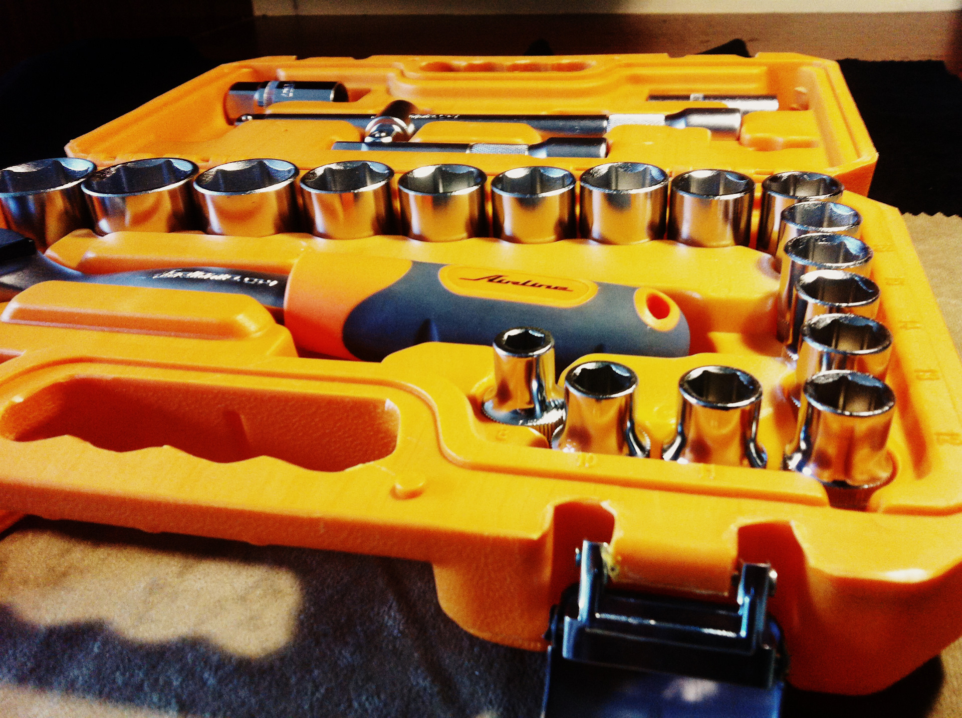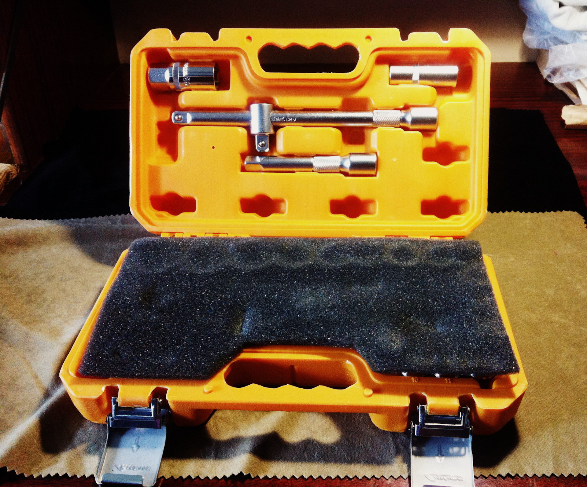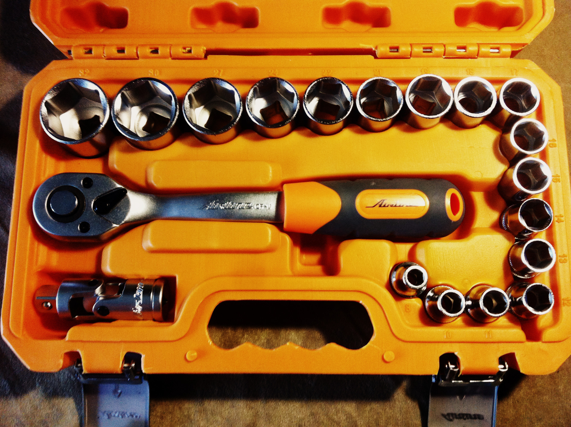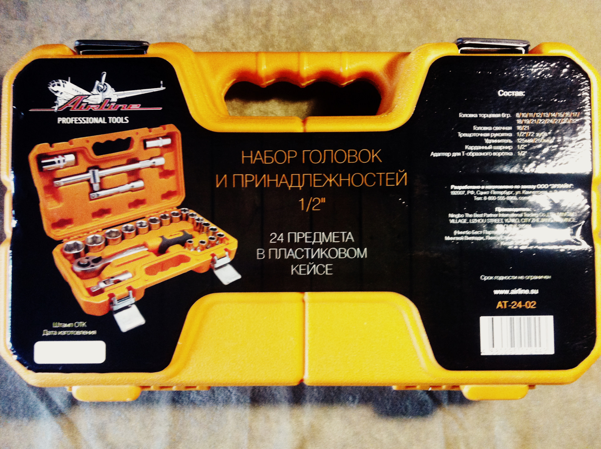 А конкретно о наборе головок и принадлежностей ½ дюйма 24 предмета в чемодане от компании www.airline.su/ . Честно признаюсь, всегда мечтал о трещеточной рукояти ( трещетка ), так как я всегда обходился тем что попадется под руку … Создавая всевозможных франкенштейнов дабы открутить болт в трудно доступном месте . Я думаю меня многие поддержат в том, что такой небольшой набор инструментов, необходим каждому истинному автомобилисту ! Да и приобрел я его по хорошей акции . В наборе есть все что нужно . Весь спектр торцевых головок и даже на 32 !