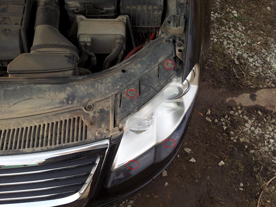 После этого уже можно бампер немного сдернуть вперед чтобы можно было подобраться к двум винтам под фарой, после чего выкручиваем два самореза сверху и фара в руках