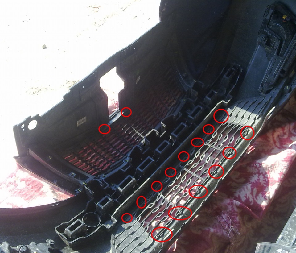 Решил поставить сетку на что-то серьёзнее чем термоклей. Купил стяжки пластиковые черные. Снял бампер. Второй раз снял намного быстрее. Минут за 20.
